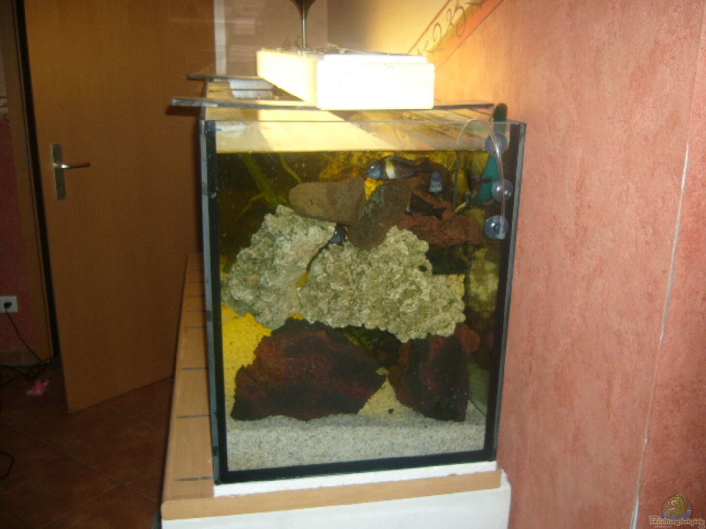 Statt einer rück-und seitenwand habe ich die wände miit gestein verkleidet , Diese habe ich im Becken so angeordnetdas sich viele Spalten und gro??e/kleine Höhlen ergeben .So können die Barsche Reviere abstecken und sich auch mal `aus dem Weg gehen.Auch der direkte Blickkontakt kann so vermieden werden. Da die Steine gleichzeitig aufgebaut sind, können sie schön durchschwommen werden.da das Gestein an der Rück , Seitenwände bis zur abgeckung gestapelt ist, Sieht man natürlich den Heizstab [...]
