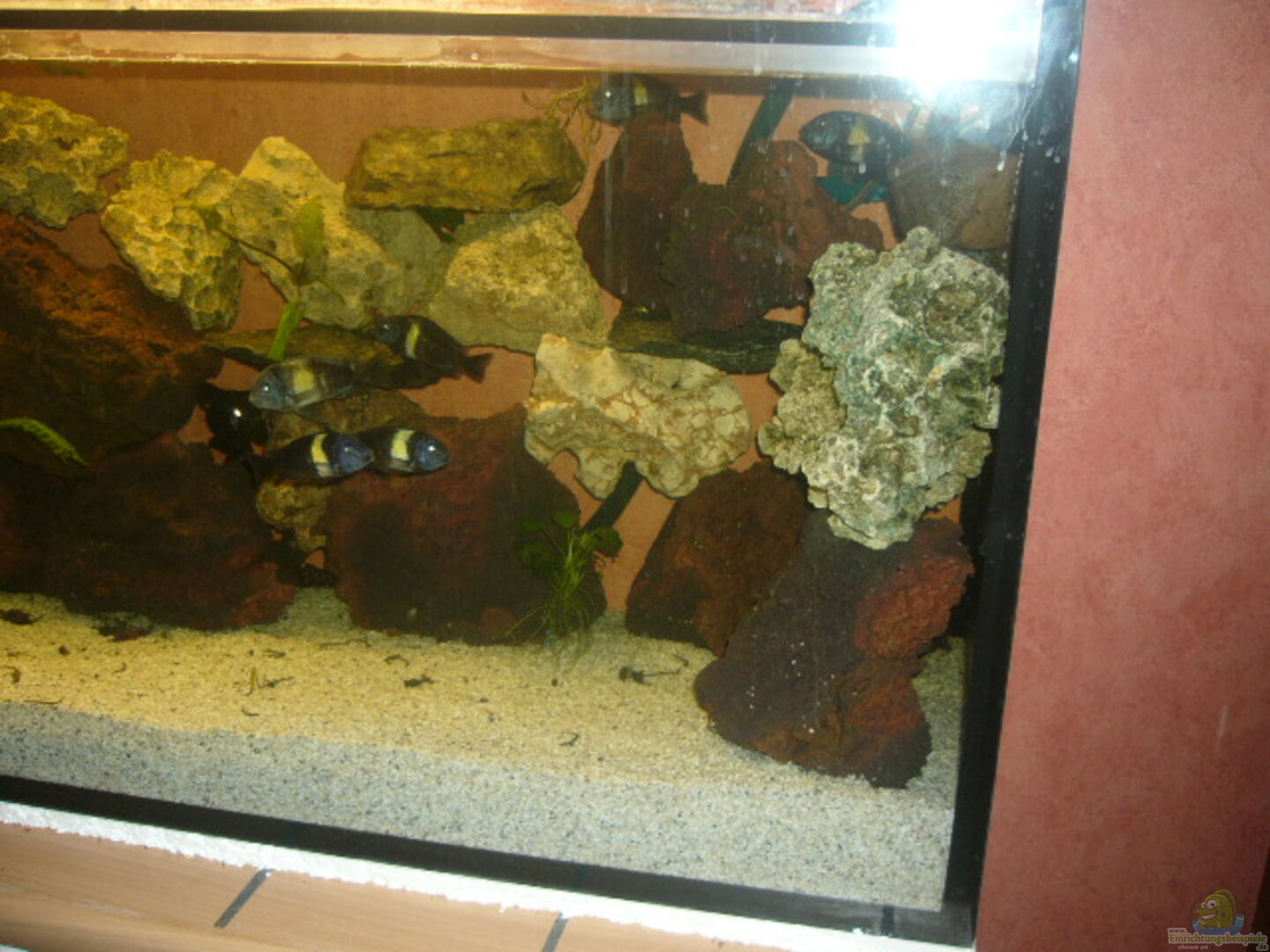 Statt einer rück-und seitenwand habe ich die wände miit gestein verkleidet , Diese habe ich im Becken so angeordnetdas sich viele Spalten und gro??e/kleine Höhlen ergeben .So können die Barsche Reviere abstecken und sich auch mal `aus dem Weg gehen.Auch der direkte Blickkontakt kann so vermieden werden. Da die Steine gleichzeitig aufgebaut sind, können sie schön durchschwommen werden.da das Gestein an der Rück , Seitenwände bis zur abgeckung gestapelt ist, Sieht man natürlich den Heizstab [...]