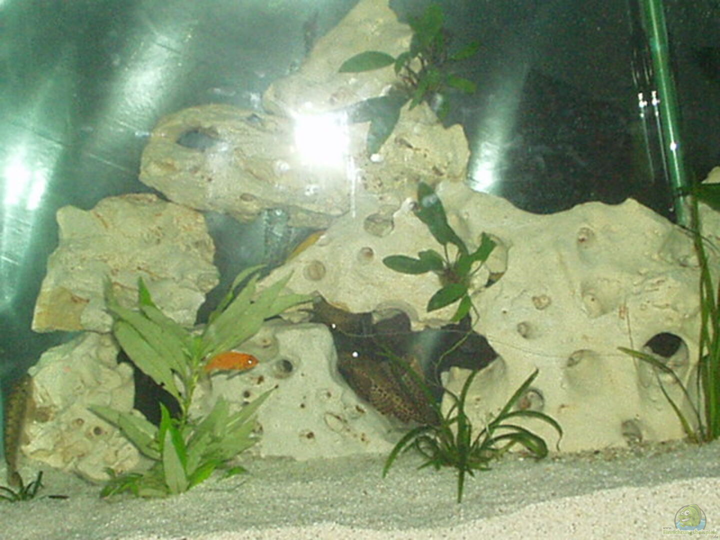 Ich verwende wei??es Lochgestein (ca.50kg) und habe es so angeordnet, da?? genügend Vesteckmöglichkeiten - auch für Jungtiere - vorhanden sind, weiters 1 Wurzel für meine Welse, sie dient auch als Unterschlupf