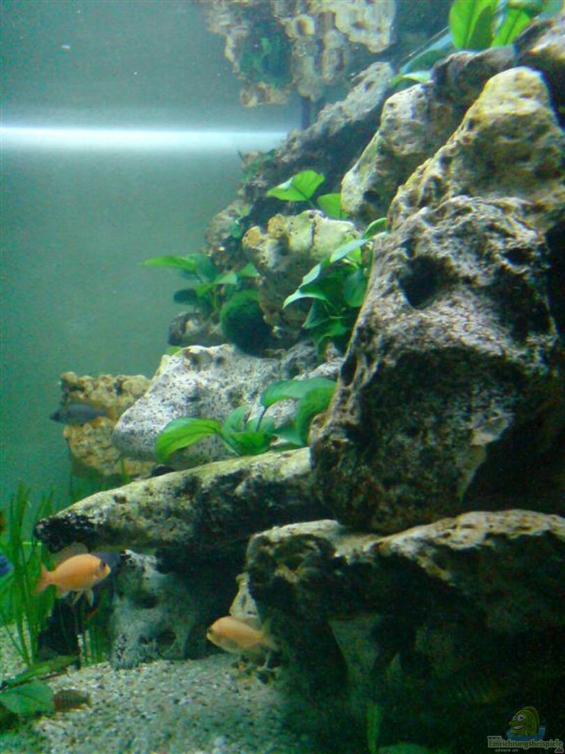 Komplette Lochgestein Aufbauten (ca. 350 kg). Viele Verstecke und Hölen, dazu endlose Ritzen wo sich Brut verstecken kann. Die Aufbauten ragen bis unter die Wasseroberfläche, über den Kamm der Aufbauten ist ziemlich Ströhmung, da dort die ´Fluval´ verbaut ist um eine schöne Oberflächenbewegung zu erzeugen.