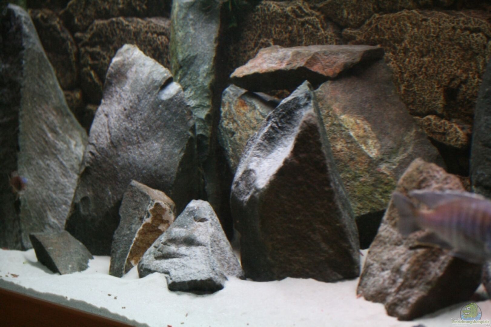 Ca. 350 KG grosse Felsbrocken aus einem Bach bei uns in der Nähe. Das kommt dem Malavisee glaube ich recht nahe, die Fische lieben die Felslandschaft, Sie schwimmen wesentliche agiler und mehr hin und her als vorher. Zwichen den Felese sind jede Menge Höhlen und Ritzen wo sich die Fische zurückziehen könnnen. Die Steine stehen auf 2 cm starken Styproporplatten.