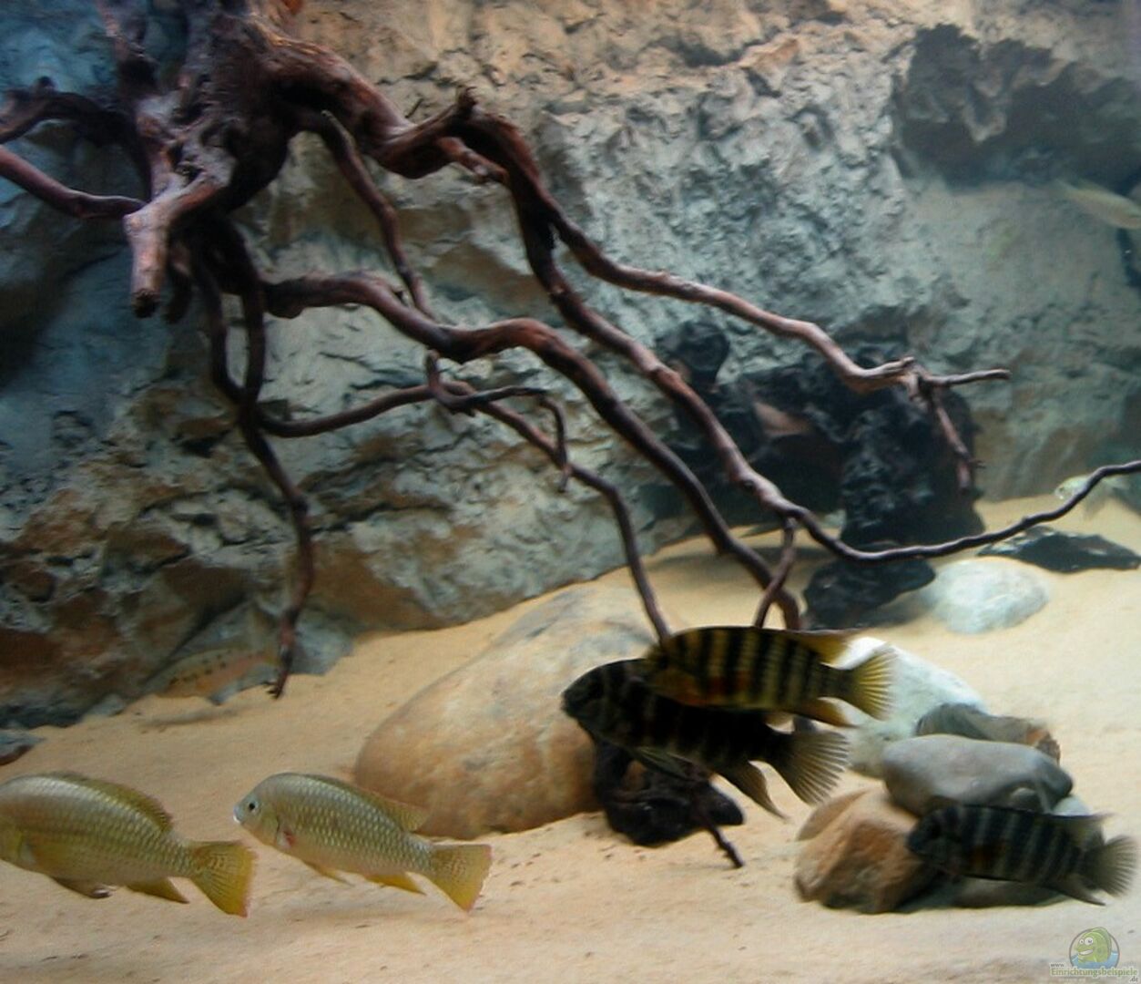 Die Einrichtung sollte so weit wie möglich dem natürlichen Habitat der Fische entsprechen und ist nach Sichtung einiger Habitatsfotos dementsprechend spärlich ausgefallen. Sie besteht lediglich aus ein paar Wurzeln und einigen Bachkieseln, die teilweise solitär und zum Teil zu zu Höhlen bzw. Verstecken angeordnet sind. Die Rückwand stammt von Steinzeit-Design und wurde möglichst passgenau eingearbeitet. Die verbliebenen kleinen Spalten wurden entweder mit Aquariensilkon verfüllt oder [...]
