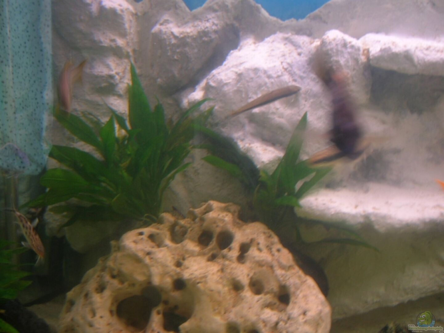 Rückwand, selber gebaut mit Styripoc, Bauschaum und Portlandzement.Komplett an dem Glas hinten verklebt. Lochgestein ( 35 kg, 30 kg, ) die Steinen liegen auf plexiglas, ein paar Steine sind so gelegt und befestigt das sie untergraben werden können, was die Fische auch fleissig tun.Im Hintergrund sind noch Dekosteine mit gro??en Höllen versteckt und der vordere grö??ere Teil des Auquariums ist freier Schwimmraum