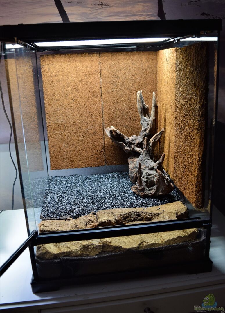 Moorkienholz, das frei gesteckt im Terrarium ausrecht steht ohne Silikon bzw. Bauschaum, Seitenwände sind an 2 Seiten mit Xaximplatten verkleidet