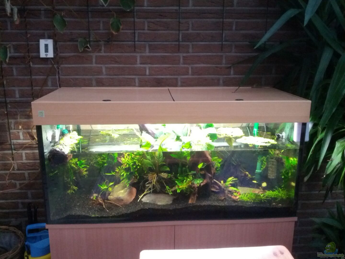 Dominiert wird das Becken von 2 grossen Wurzeln welche optisch zu einer zusammengefasst sind. Diese sind mit den Anubia und Javafarn dicht bepflanzt, wodurch diverse unterschiedlich dunkle Höhlen entstehen die gerne angenommen werden. Die Seiten werden von einigen dicken Steinen und diversen kleineren Holzstücken flankiert welche ebenfalls mit Javafarn bepflanzt sind. Die Hauptwurzel ist oberhalb der Wasserlinie mit Moos(aus dem Garten) bepflanzt. Des weiteren treiben an der Wasseroberfläche [...]