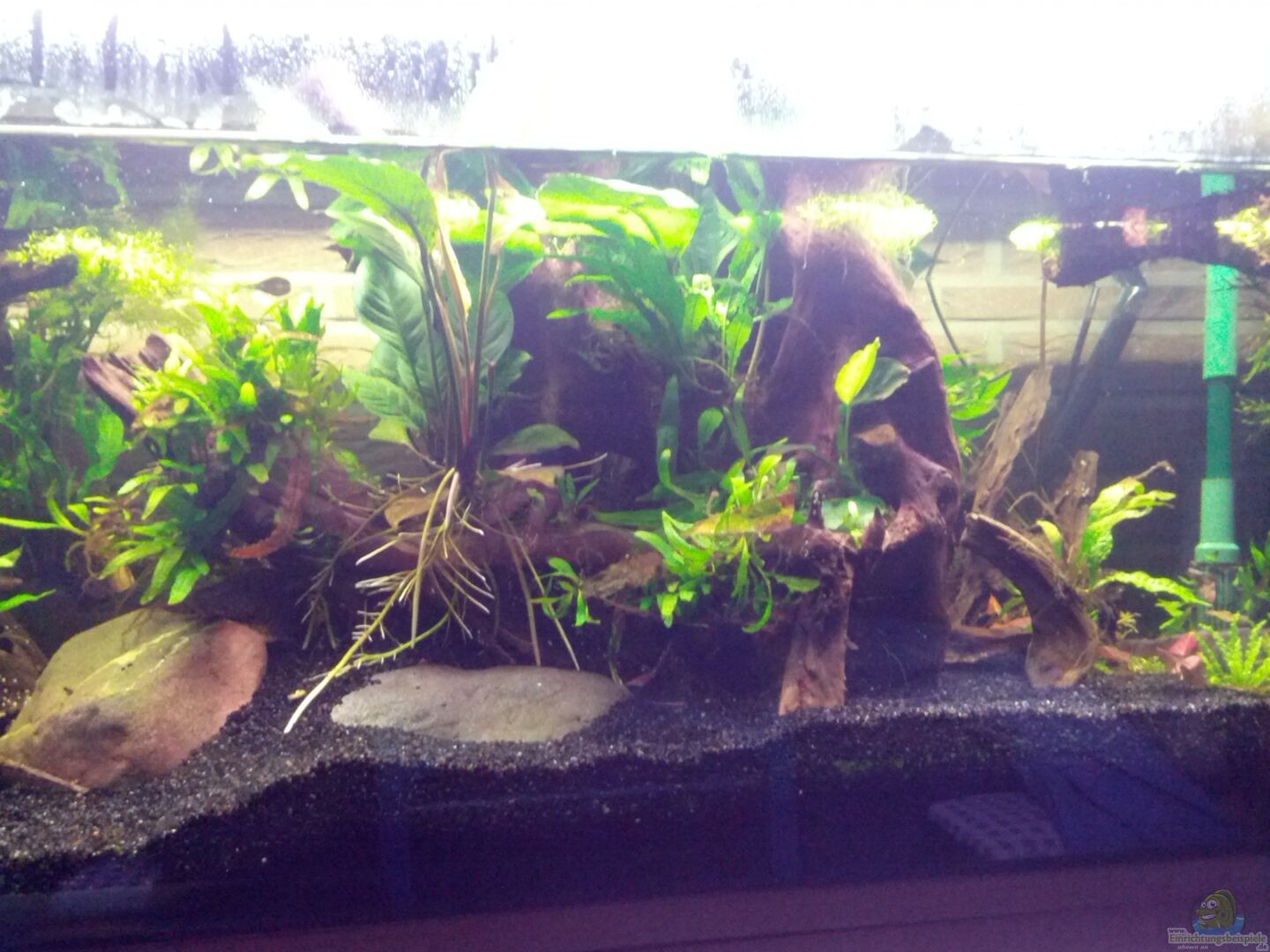 Dominiert wird das Becken von 2 grossen Wurzeln welche optisch zu einer zusammengefasst sind. Diese sind mit den Anubia und Javafarn dicht bepflanzt, wodurch diverse unterschiedlich dunkle Höhlen entstehen die gerne angenommen werden. Die Seiten werden von einigen dicken Steinen und diversen kleineren Holzstücken flankiert welche ebenfalls mit Javafarn bepflanzt sind. Die Hauptwurzel ist oberhalb der Wasserlinie mit Moos(aus dem Garten) bepflanzt. Des weiteren treiben an der Wasseroberfläche [...]
