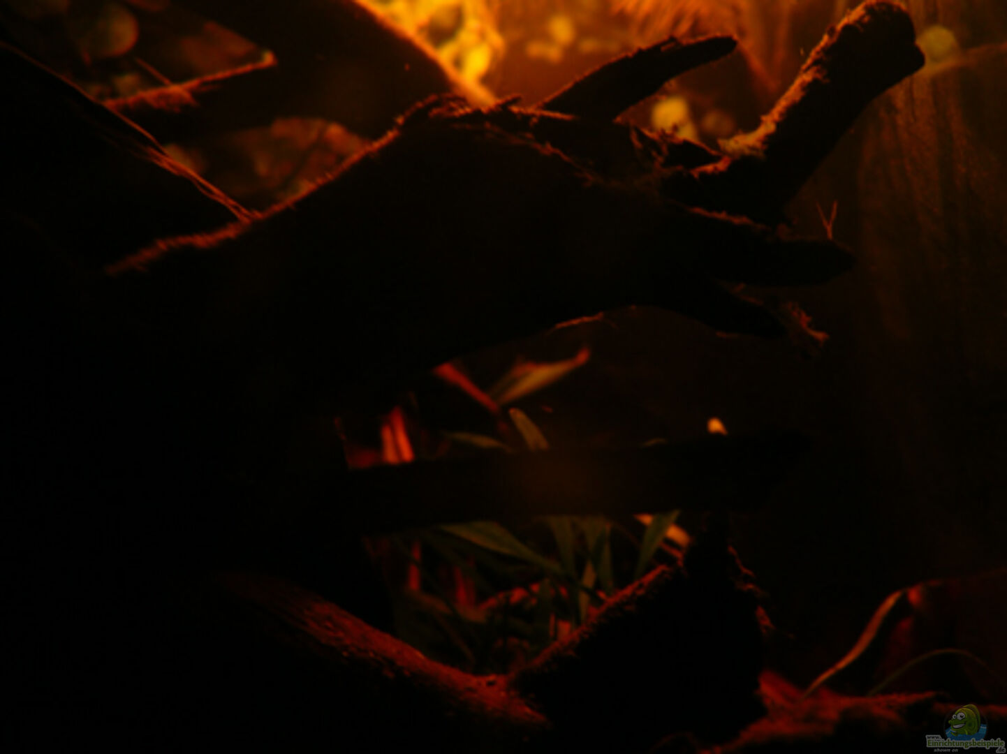 Von Anfang an Stand fest, dass es viele Verstecke und Reviergrenzen geben muss. Dieses soll sowohl durch viel Holz als auch durch Steine auf dem Boden erreicht werden.Die zum Teil recht gro??en Steine verdecken auch über eine höhere Höhe die Sicht. _____ Materialliste: Wurzeln aus dem Moor Sandstein Buchenblätter Mulm (zum wühlen, unter den Wurzeln links) Zusätzlich wurden Erlenzapfen in einem Beutel ins Becken gehängt, die das Wasser bräunlich färben sollen. [...]