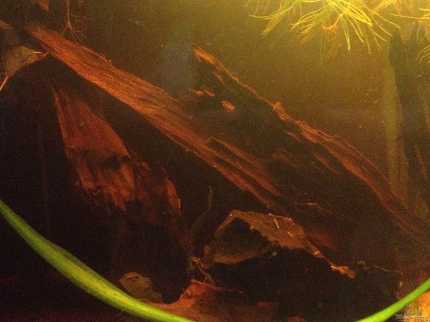 6 Moorkinwurzeln 20 Murnockerl in der Körnung von 3-15 cm Erlenzapfen Blätter des Seemandelbaumes Auf eine Rückwand im Inneren des Beckens habe bewusst wegen der geringen Tiefe nicht eingesetzt. Eine schwarze Folie an der Rückwand aussen suggeriert aber eine gewisse Tief und gibt den Fischen etwas Deckung weil es schön hinten abdunkelt.