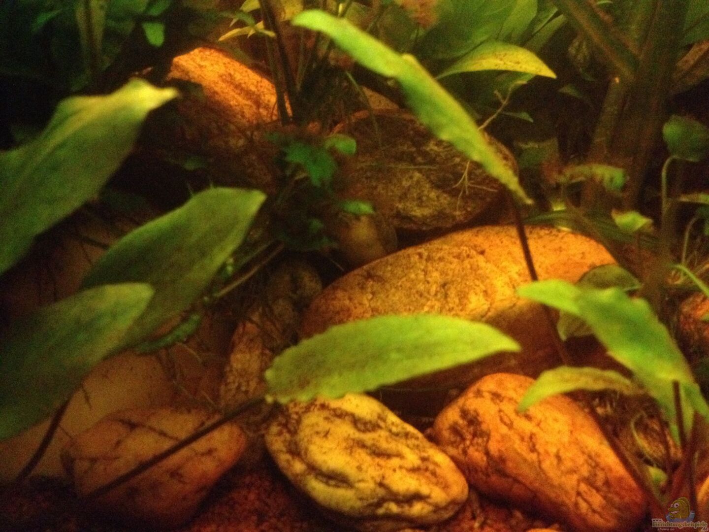 6 Moorkinwurzeln 20 Murnockerl in der Körnung von 3-15 cm Erlenzapfen Blätter des Seemandelbaumes Auf eine Rückwand im Inneren des Beckens habe bewusst wegen der geringen Tiefe nicht eingesetzt. Eine schwarze Folie an der Rückwand aussen suggeriert aber eine gewisse Tief und gibt den Fischen etwas Deckung weil es schön hinten abdunkelt.