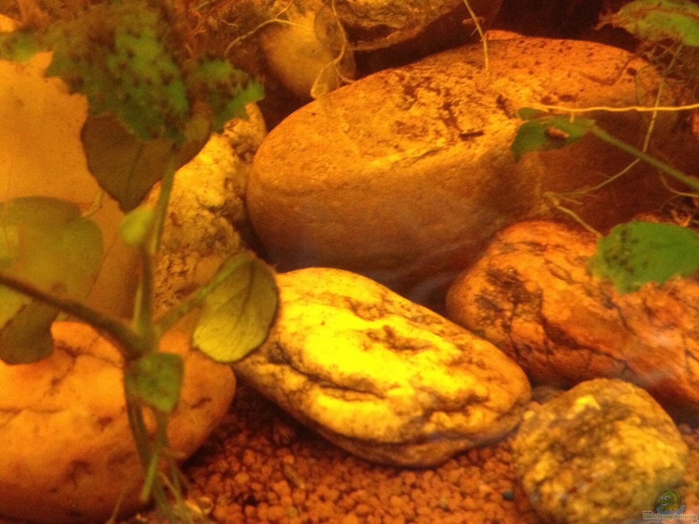 6 Moorkinwurzeln 20 Murnockerl in der Körnung von 3-15 cm Erlenzapfen Blätter des Seemandelbaumes Auf eine Rückwand im Inneren des Beckens habe bewusst wegen der geringen Tiefe nicht eingesetzt. Eine schwarze Folie an der Rückwand aussen suggeriert aber eine gewisse Tief und gibt den Fischen etwas Deckung weil es schön hinten abdunkelt.