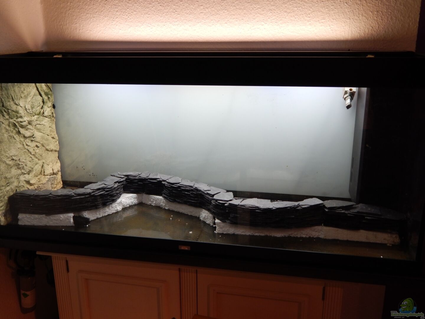Rückwand : Milchglasscheibe 45% LD , 2mm 4 kleine Naturholzwurzeln , 1gro??e Traumwurzel Rote Jaspersteine für Höhlen Eine Terrasse aus Naturschiefer