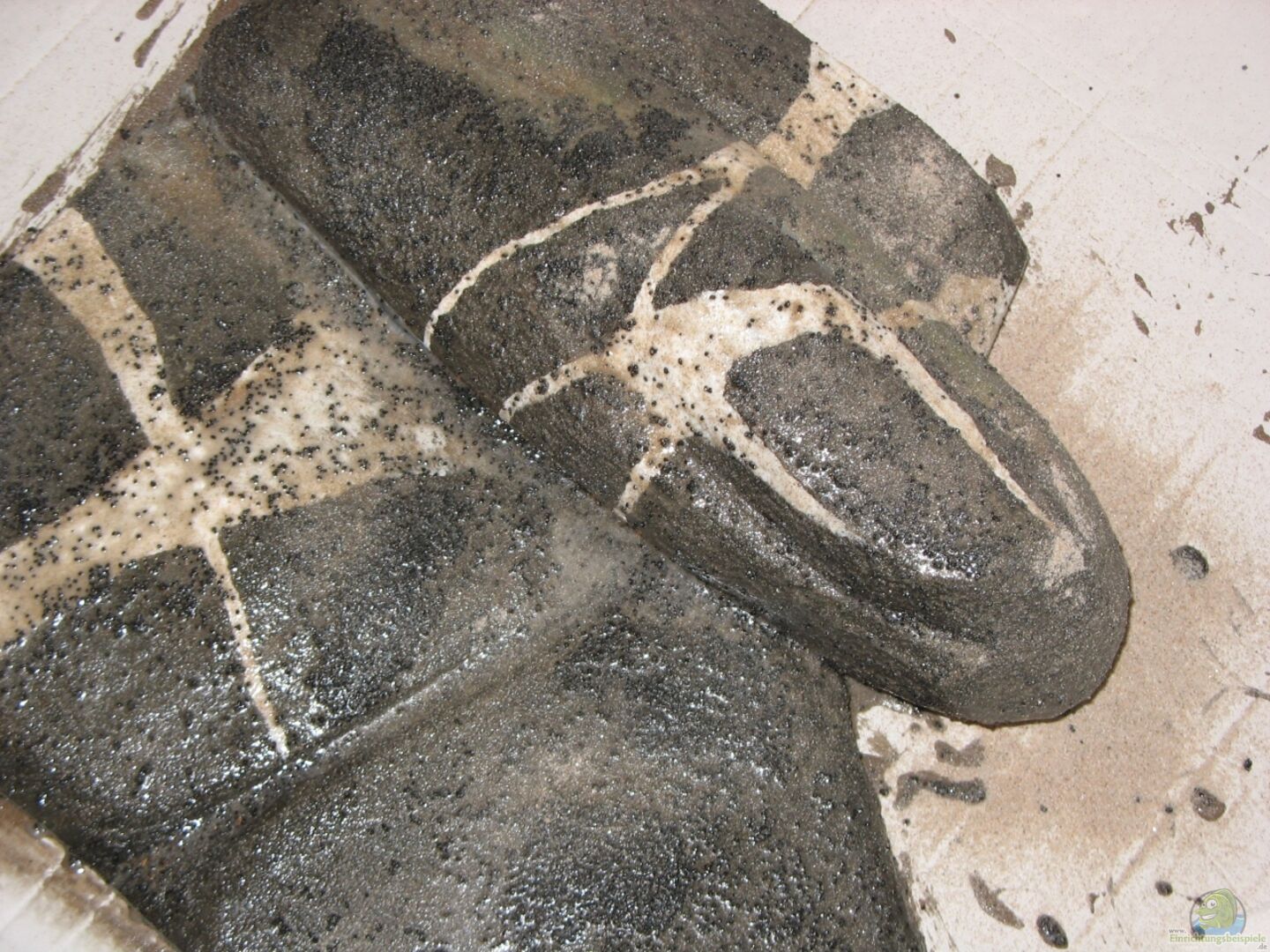 Rückwand: 2 Selbst gemachte Module jeweils in der linken und rechten Beckenhäfte. Das rechte Modul ist mehr ein grö??erer Felsen, an der tiefsten Stelle ca 20 cm tief und hinterschwimmbar. Der Felsen wurde mit Portlandzement und Baugittergewebe modelliert und danach mit Breddermann E 45TM versiegelt. Dieses Modul ist ein sehr massiges und schweres Teil, das etwas schräg gegen die Rückwand gelehnt wurde. Zum Schutz für die Scheibe sind Stücke groben schwarzen Filterschaumes an dem [...]