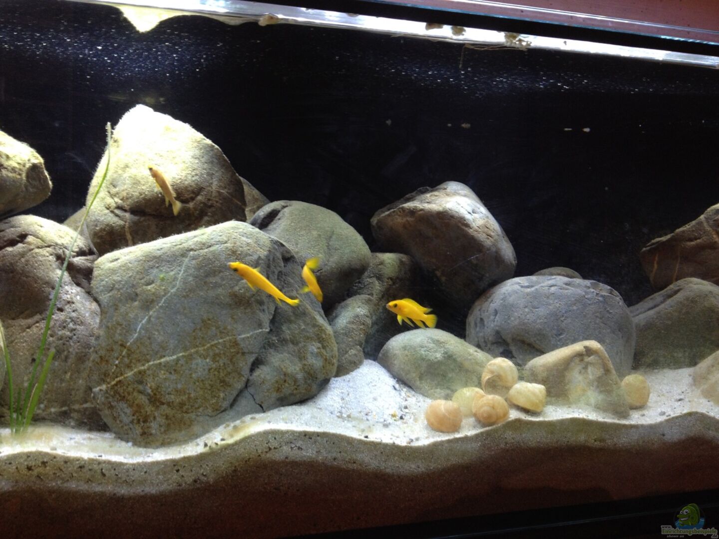 Als weitere Einrichtung habe ich Stein aus uns unserem Garten gewählt. Es sind 200kg. Sie sin d so angeordnet, dass die Fische möglichst viel Höhlen und Verstecke haben. 50 Weinbergschneckenhäuser Die habe ich gewählt weil die Schneckenhäuser der Gattung neothauma doch ein bisschen zu teuer sind. Im Moment sind sie rein aus Optisch Gründen im Becken da ich kein Schnekenbrüter halte