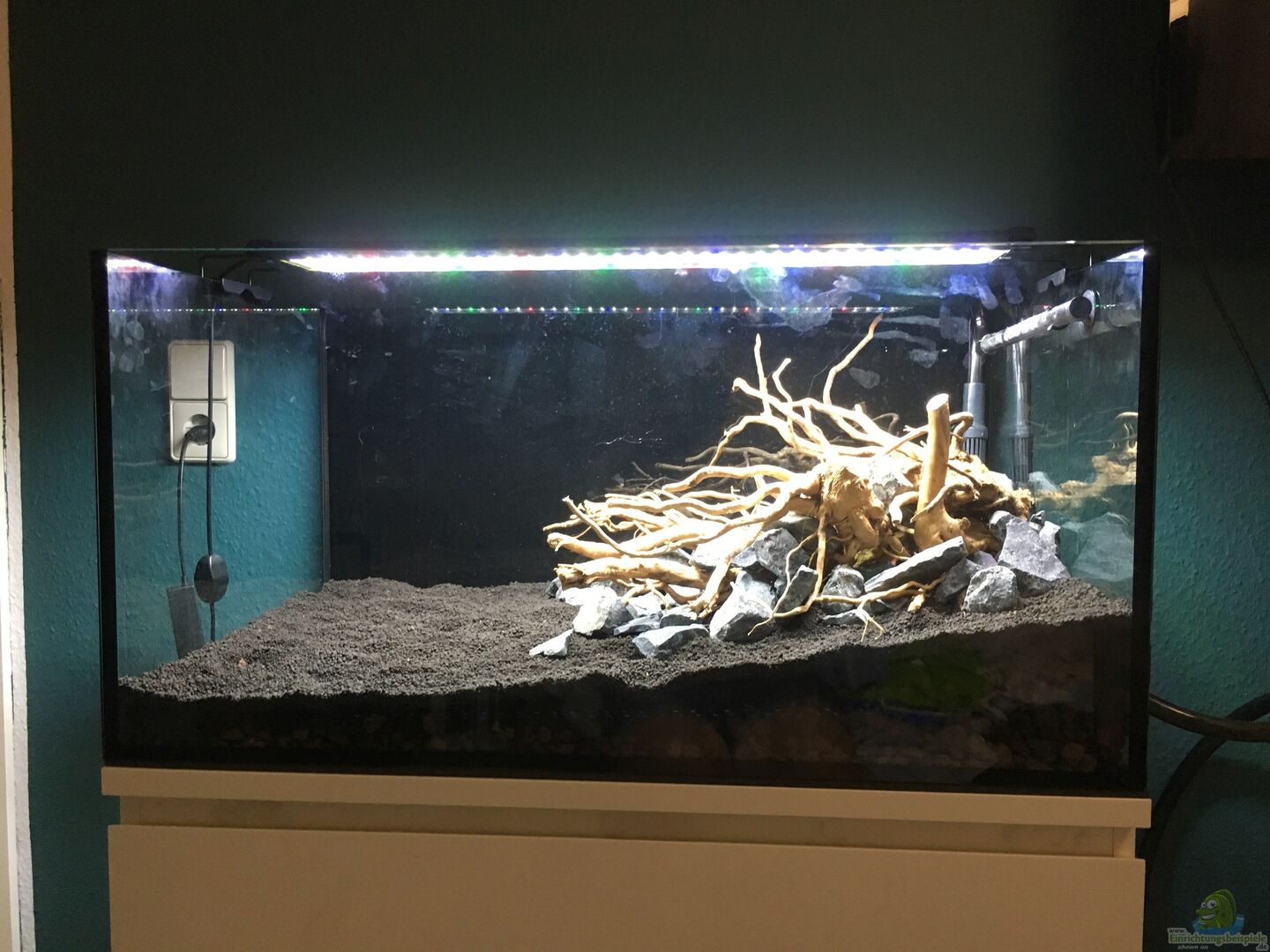 4 Fingerwurzeln medium 1 Fingerwurzel grande Die Wurzeln habe ich so gestapelt, dass sie aussehen wie Baumwurzeln, die ins Wasser ragen. ca. 15kg schwarzer Basalt Gro??er Steinhaufen, durch den viele Höhlen entstehen. 1 Zwergbuntbarsch Laichhöhle Um den ZBB verschiedene Rückzugsmöglichkeiten zu bieten.