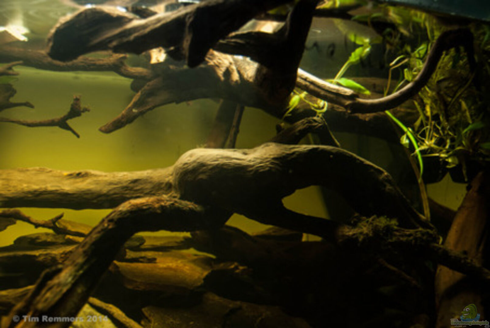 Die Einrichtung kommt frisch aus dem Wald. Fast alle Wurzeln habe ich am Tag des Einrichtens aus dem Wald geholt (ich habe nur Hartholz verwendet) und grob die Rinde abgemacht (wirklich sehr grob und auch nur das, was mit der Bürste abging. Dann habe ich die Wurzeln ohne weitere Behandlung ins Becken geschmissen. Die Steine sind am selben Tag organisiert. Es handelt sich überwiegend um dünne Sandsteinplatten (die recht dunkel sind). Au??erdem hatte ich noch einen Rest schwarze "felsige" [...]