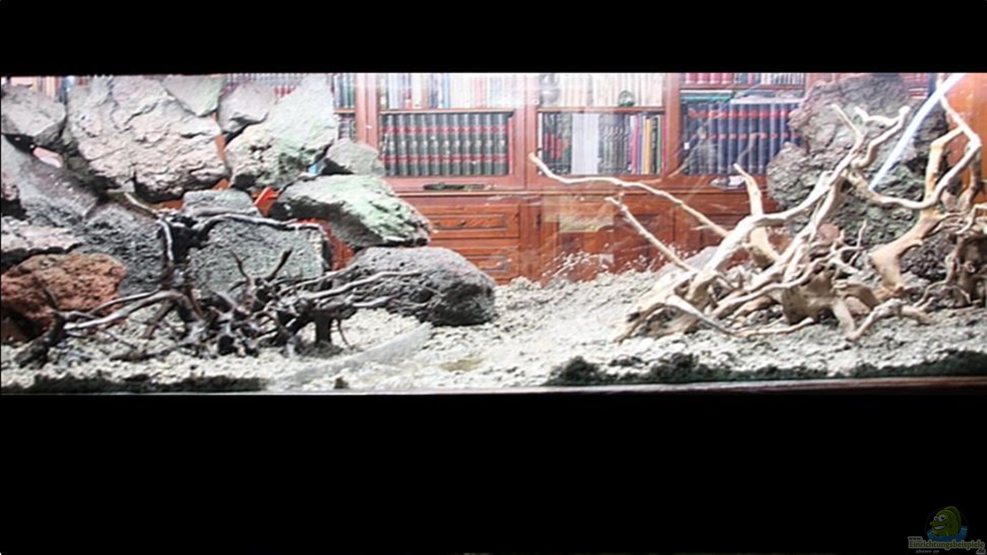 Rote Moorwurzeln, Spiderwood Braune Lava Brocken + Lava Gestein (vom F. Zentral Massif) +/- 20 Erlenbaum Zapfen + Eichenblätter, zur Hälfte neue alle Monate Cholla-wood Näste für Garnelen Versteck, hinter der Lavasteinmauer, nicht sichtbar von vorne