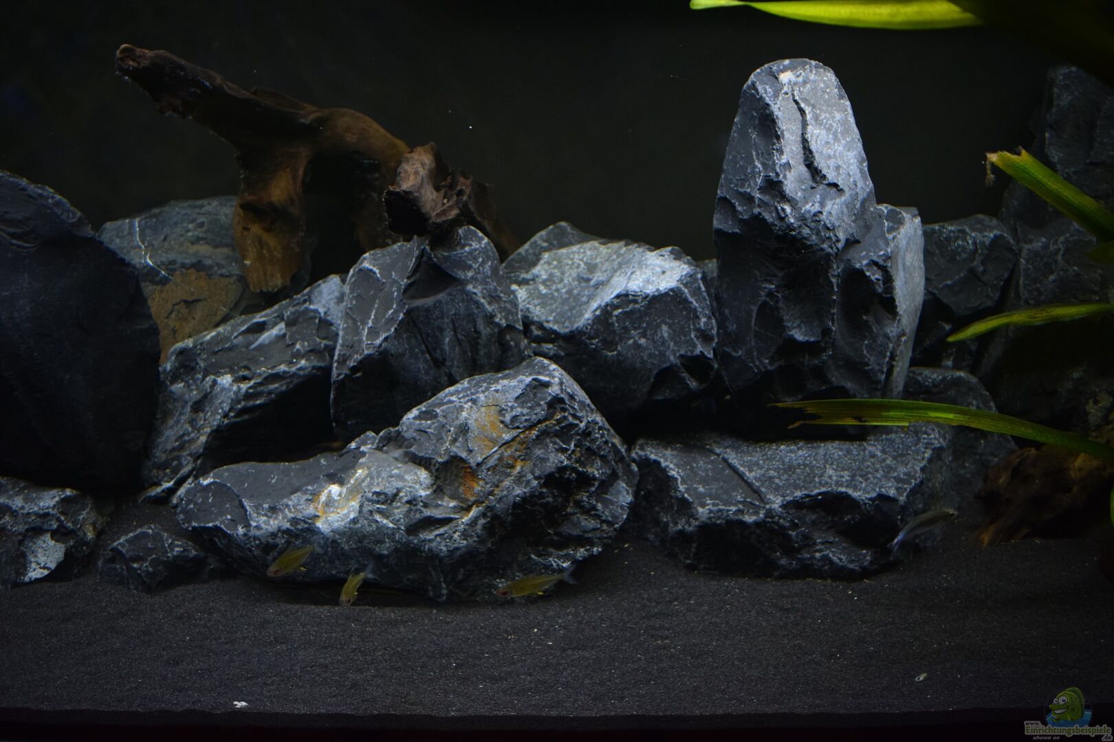 80kg schwarzer Basaltstein in unterschiedlicher Körnung. Ich bin mir noch unschlüssig, ob mir der Spagat zwischen vielen Höhlen (bzw. Reviergrenzen) und genug freien Schwimmraum gelungen ist, hier würde ich mich über eine Stellungsname freuen. Die Steine stehen auf einer 3cm dicken Styroporplatte. In der Mitte wurde eine kleine Wurzel aus Mangrovenholz platziert, ebenso auf der rechten Seite (ich freue mich schon über die Diskussion über die winzig kleine Menge an Gerbstoffen ;^] ) Kokosnusshöhle [...]