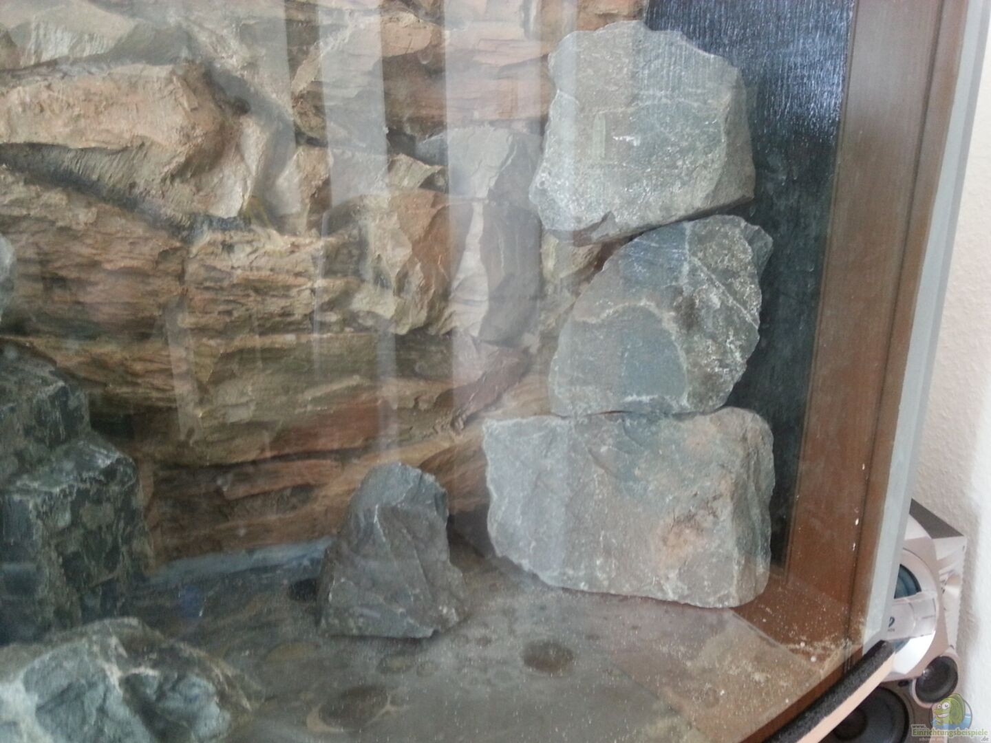 3-D Rückwand Rocky Stone hinterschwimmbar, wodurch sehr viel Wasservolumen gewonnen wird ca. 90 Kg Grauer Basalt 3 künstliche Module passend zur Rückwand Modul SH-28 Modul SH-27 Modul SH 20 Wobei das kleine Module an die Glasmittelstrebe geklebt wurde und somit von oben ins Becken ragt. Einen etwa 110 cm langen trockenen Buchenast der von links oben ins Becken rein geht und sich bis ganz nach rechts zieht!