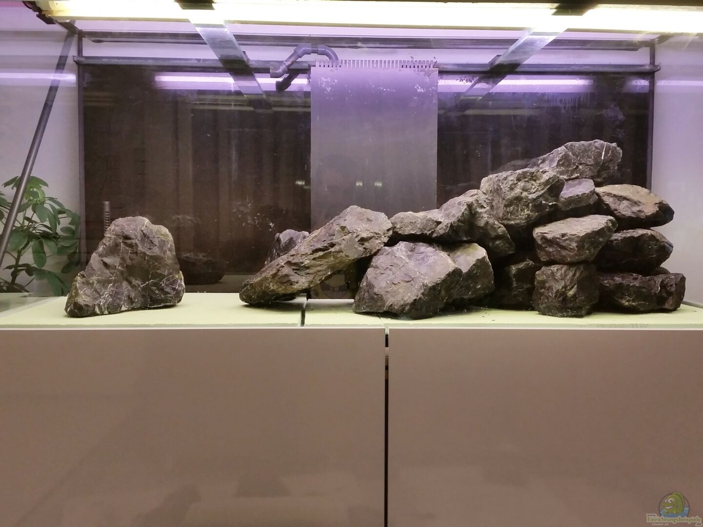 Im Becken befinden sich ca 150 bis 200kg Basaltgestein, welches ich als Felszone gestaltet habe. Das Basaltgestein wurde Mauerförmig mit vielen Hölen gestaltet. Durch diese Anordnung entstehen viele Reviere und Sichtschutzmöglichkeiten für Rangniedrigere Tiere. Das Basaltgestein habe ich auf 30 mm dicken Styrodurplatten gestaffelt um die Bodenplatte zu schonen und ein Umfallen durch Untergraben zu unterbinden.