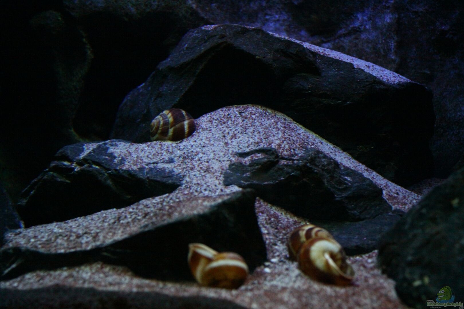 eingepasste 3-D Rückwand mit Felsüberhang und Versteck für die Strömungspumpe und Wasserwechsel. ca.120 kg Basaltgestein vom naheliegenden Steinwerk Die Basaltfindlinge wurden aus 3 Gründen ausgehöhlt 1.Gewichtreduzierung, da ich mit den grossen Brocken Aktzente setzen möchte 2.Es bleibt mehr Wasservolumen, da ca 30-40 kg Material weggefallen sind 3.zusätzliche Versteck und Rückzugsmöglichkeiten Diese werden natürlich so platziert, das die Höhlen nicht zu sehen [...]
