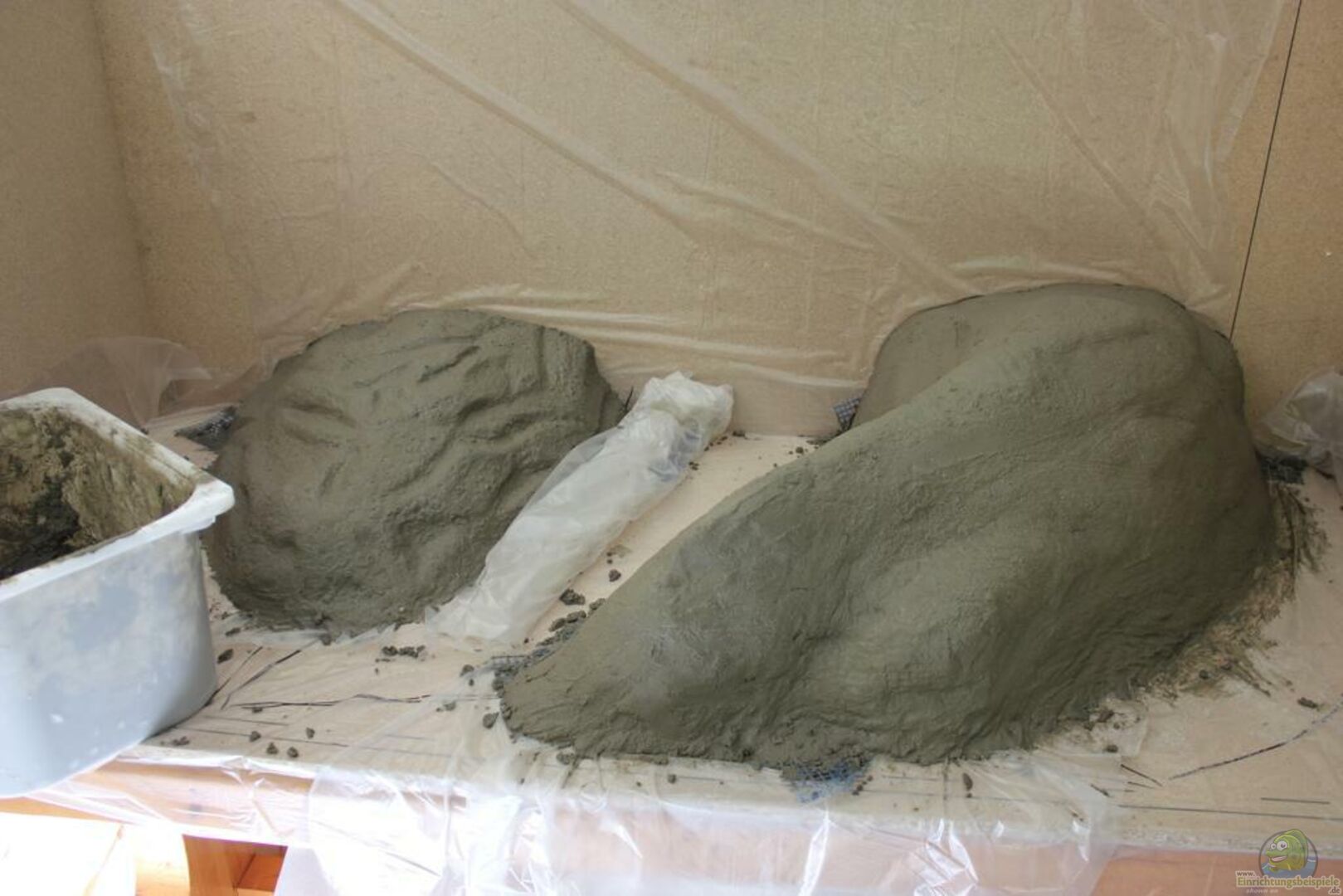 Bodenscheibe wurde durch Plexiglasplatten 5mm geschützt, diese wurden mit Silikon eingeklebt damit sich kein Sand druntersetzt. Eigenbau Rückwandmodule, Schachtverkleidung und 3 x ´Steine´: Die Schachtverkleidung, der Fels an der linken Seitenscheibe, der Fels in der rechten Ecke und die 3 grö??eren Steine sind von innen hohl und dienen als Rückzugsmöglichkeit. Sie wurden aus CEM1 + Quarzsand (Verhältnis 1 zu 2) zementiert, auf einem mit Armierungsgewebe überzogenen Styropor- Rohling. [...]