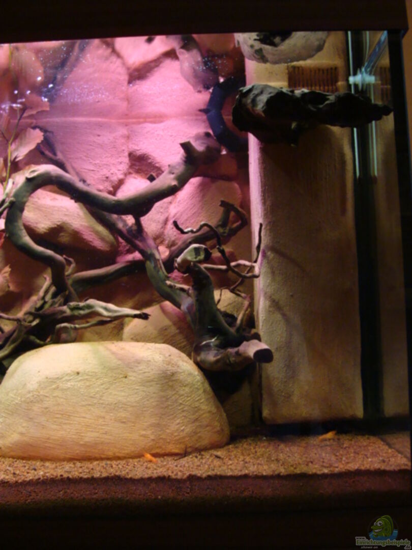 Selbsgebaute Rückwand und Felsmodule welche innen hohl und somit als Höhle nutzbar sind Materialien: Styrodur, Portlandzement CEM1 und Abtönfarbe, Rückwand wurde vor dem Einbau 8 Wochen gewässert, dabei erfolgten mehrere 100% Wasserwechsel Mehrere Mangrovenwurzeln, welche bis zur Wasseroberfläche reichen um den Klettertrieb zu unterstützen.