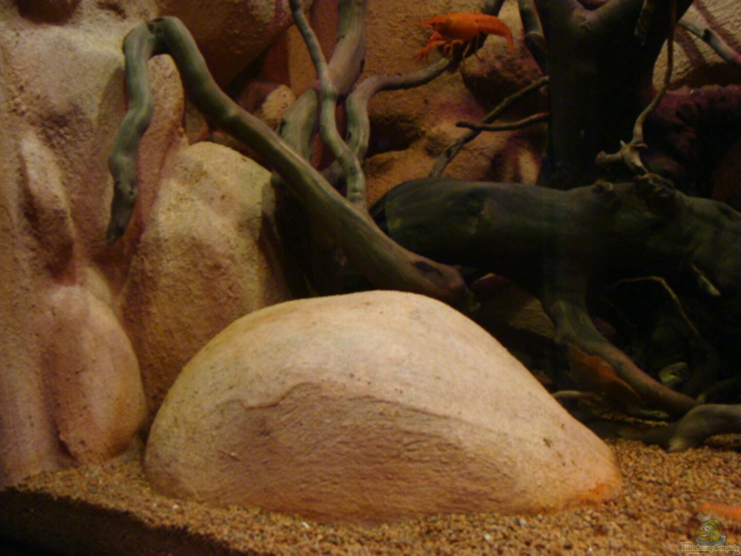 Selbsgebaute Rückwand und Felsmodule welche innen hohl und somit als Höhle nutzbar sind Materialien: Styrodur, Portlandzement CEM1 und Abtönfarbe, Rückwand wurde vor dem Einbau 8 Wochen gewässert, dabei erfolgten mehrere 100% Wasserwechsel Mehrere Mangrovenwurzeln, welche bis zur Wasseroberfläche reichen um den Klettertrieb zu unterstützen.