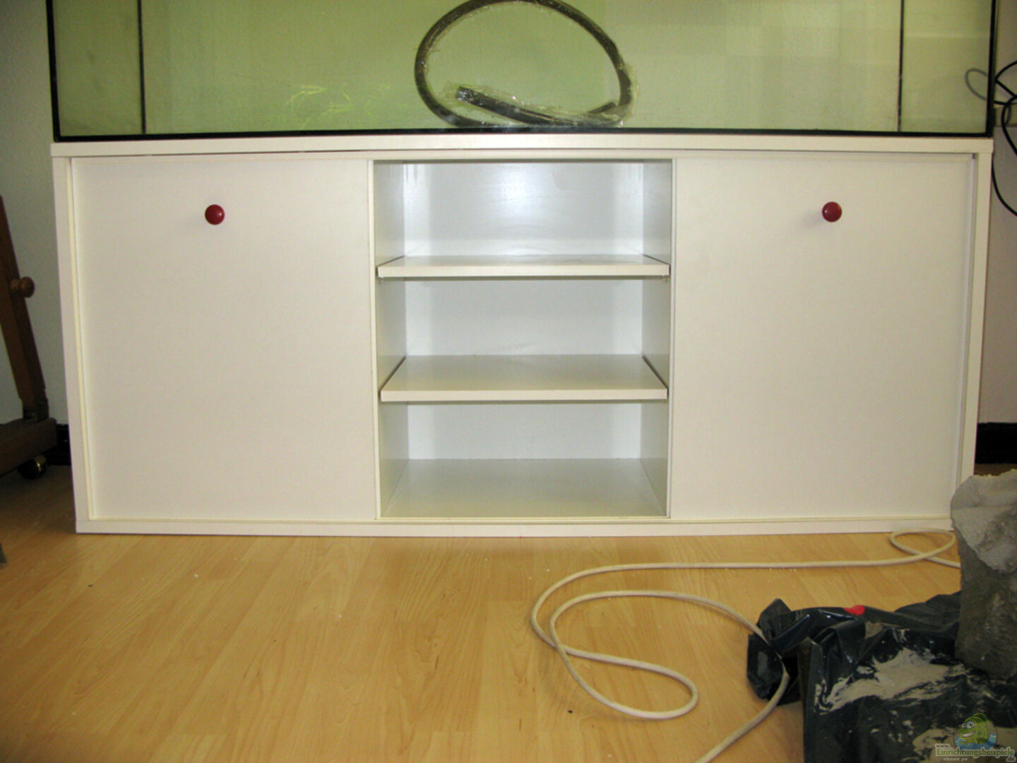 Hinter dem Becken befindet sich eine dreidimensionale selbstgebaute Rückwand. Diese besteht aus einer 150 x 50 cm Siebdruckplatte, an den Seiten jeweils eine 5 x 50 x 1, 6 cm, wei??eschichtete Spanplatte, verstärkt oben und unten mit Vierkantleisten 2 x 2 cm. In die Rückwand wurden aus Styropor Steinnachbildungen als Relief geklebt. Diese wurden mit Fliesenkleber aus Portlandzement beschichtet und mit Abtönfarbe naturalistisch eingefärbt. Die freibleibenden Teile des Hintergrund [...]