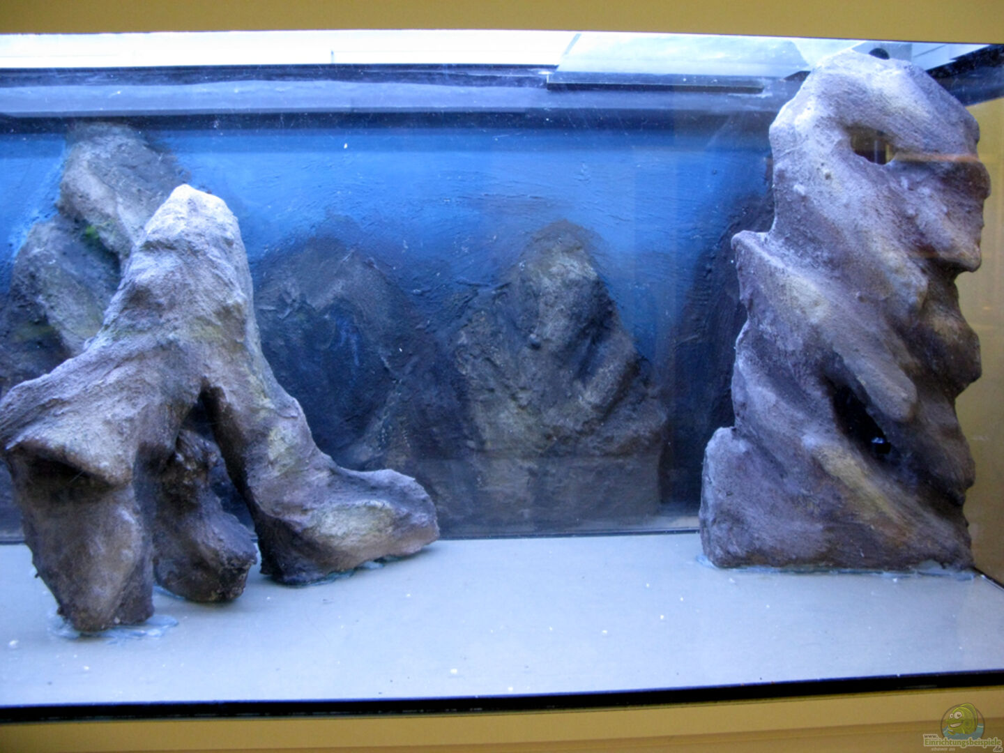 Hinter dem Becken befindet sich eine dreidimensionale selbstgebaute Rückwand. Diese besteht aus einer 150 x 50 cm Siebdruckplatte, an den Seiten jeweils eine 5 x 50 x 1, 6 cm, wei??eschichtete Spanplatte, verstärkt oben und unten mit Vierkantleisten 2 x 2 cm. In die Rückwand wurden aus Styropor Steinnachbildungen als Relief geklebt. Diese wurden mit Fliesenkleber aus Portlandzement beschichtet und mit Abtönfarbe naturalistisch eingefärbt. Die freibleibenden Teile des Hintergrund [...]