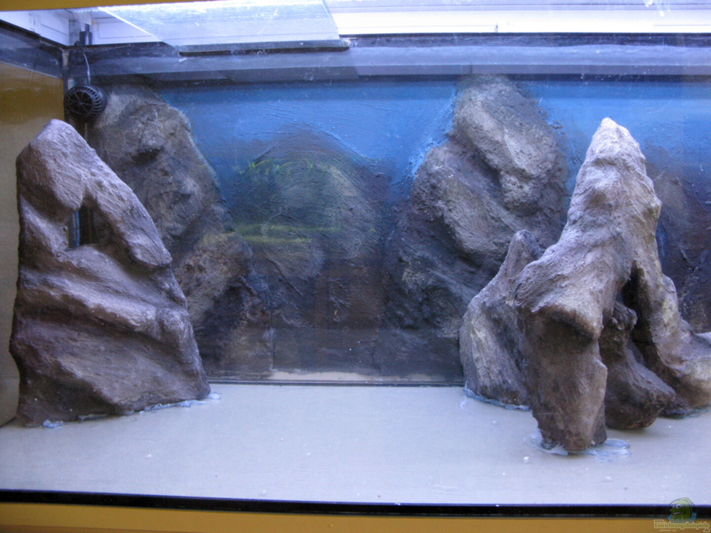 Hinter dem Becken befindet sich eine dreidimensionale selbstgebaute Rückwand. Diese besteht aus einer 150 x 50 cm Siebdruckplatte, an den Seiten jeweils eine 5 x 50 x 1, 6 cm, wei??eschichtete Spanplatte, verstärkt oben und unten mit Vierkantleisten 2 x 2 cm. In die Rückwand wurden aus Styropor Steinnachbildungen als Relief geklebt. Diese wurden mit Fliesenkleber aus Portlandzement beschichtet und mit Abtönfarbe naturalistisch eingefärbt. Die freibleibenden Teile des Hintergrund [...]