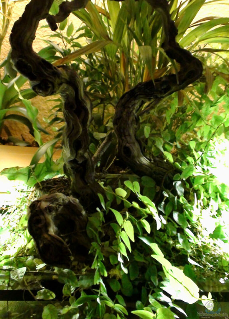 Moorkien- und Savannenwurzeln, Regenbogen-Steine , Tonröhren , eine halbe Kokusnuss sowie Höhlen aus Schiefer unter den Wurzeln . In Herbst und Winter Eichen- und Buchenlaub , ganzjährig Seemandelbaumblätter und Erlzäpfchen. Schaut nicht nur gut aus , sondern ist auch noch prima für eine natürliche Ansäuerung des Wassers .
