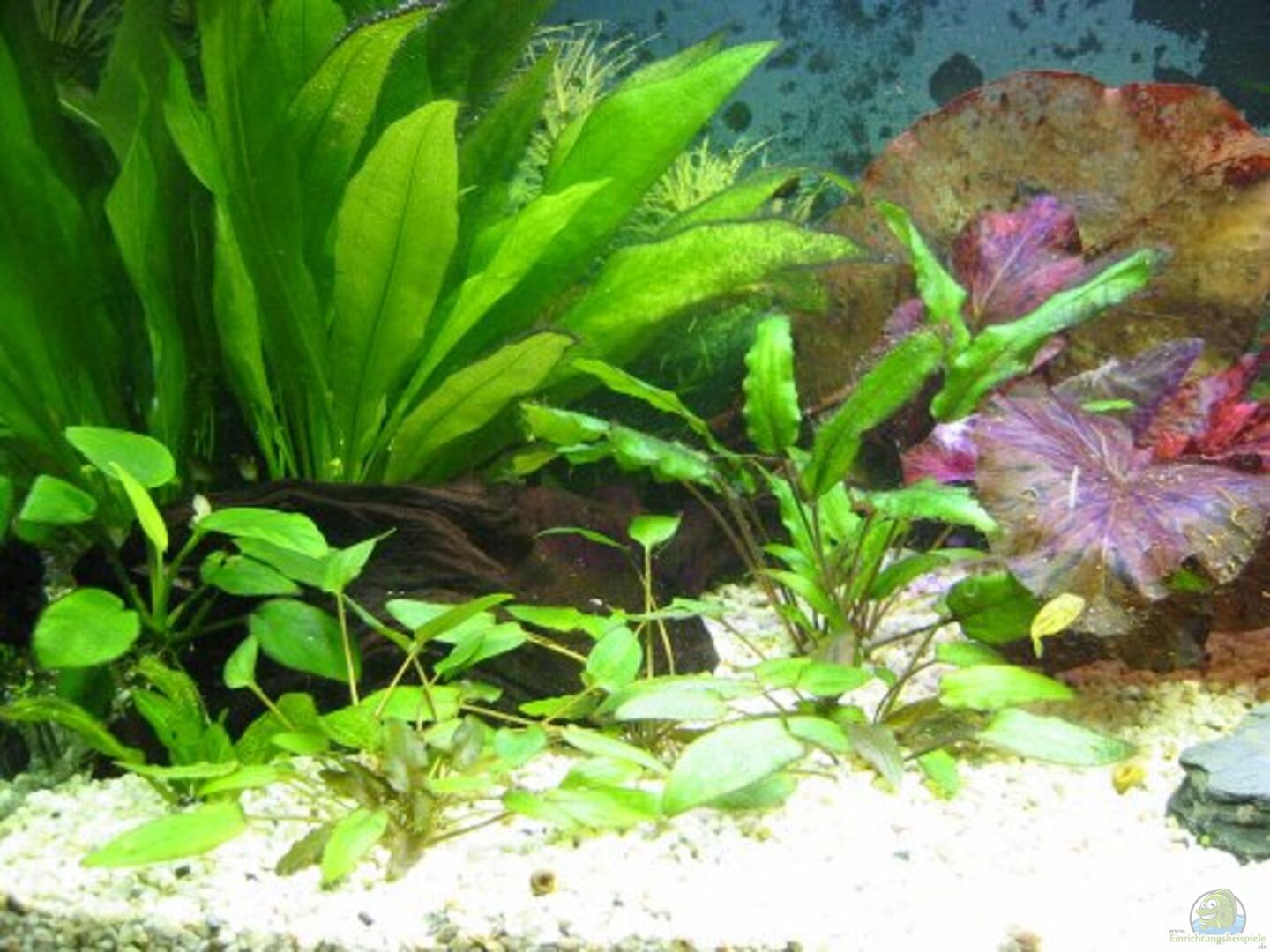 In der Mitte und im Vordergrund wurde eine ´Schwimm- und Fütterungszone´ eingerichtet, hinten und vor allem vor dem Filter soll alles schön zuwuchern. Das dauert natürlich noch. Futter geht immer auf der Schieferplatte im Vordergrund nieder. Ansonsten gibt es noch hinten Verstecke in Form von Moorkienholz, und Tonhöhlen die hinten zwischen den Pflanzen im Kies eingegraben sind.