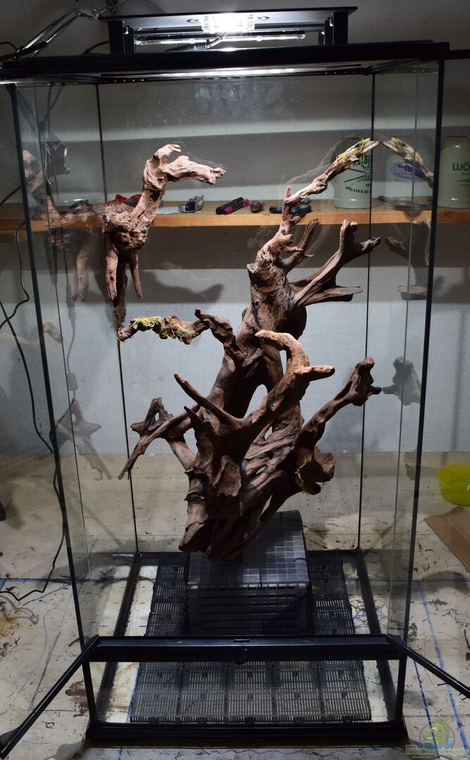 Das Grundgerüst besteht aus mit Aquariensilikon verbundenem Mangrovenholz. Diese grosse und auch schwere Wurzel steht, um ca. 8cm Höhe zu gewinnen, auf einem Podest aus mit Kabelbindern verbundenen Lichtstegplatten. Diese Podest wiederum steht aus Bodenfilterkunststoffplatten. Die Idee dahinter war, das Gewicht der schweren Wurzel, die ja noch schwerer wird, wenn sie sich mit Wasser vollsaugt, gleichmässig auf die Bodenplatte zu verteilen.