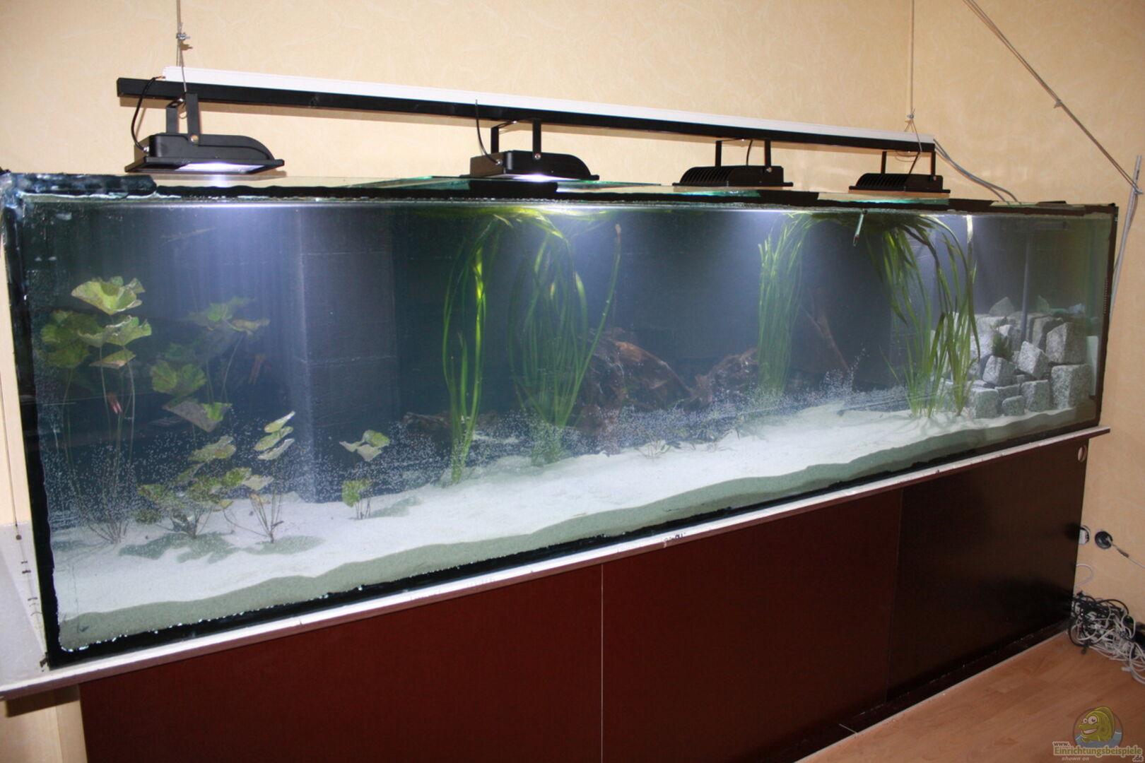 Da die Osphronemus gerne alles fressen auch Pflanzen habe ich zur Probe einige kostenlose aus meinen anderen Becken genommen. Riesenvalisnerie, Tigerlotus rot/grün, Javafarn, genoppte Wasserähre und Cryptocoryne.