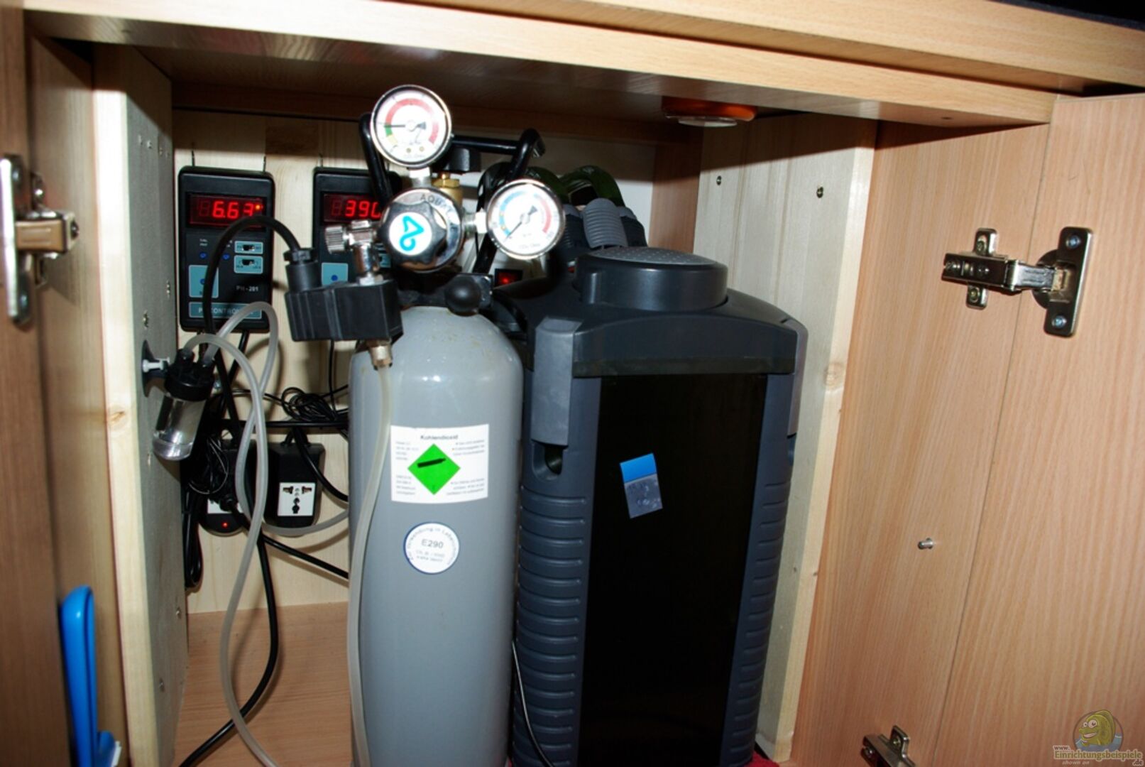 - Tunze Turbelle Nano Stream 6025( auf dem Grund hinter der Rückwand um eine Bewegung zu erhalten und keine Dreckecken zu erzeugen) -1 ph Controller (Top-Me??technik) -CO2 Anlage mit Druckminderer (JBL), 2 Manometer, 2 CO2 Flaschen (Dennerle) 2kg, CO2 Reaktor (Eheim), Rücklaufventil(JBL), 1Blasenzähler (JBL) -1 Leitwertcontroller (Top-Me??technik) -Osmoseanlage mit Druckerhöhungspumpe ´direct-flow´ (ah-aquashop) 1200l/Tag -Reiser AK-1MV (Isabi) -Diodennachtlicht grün