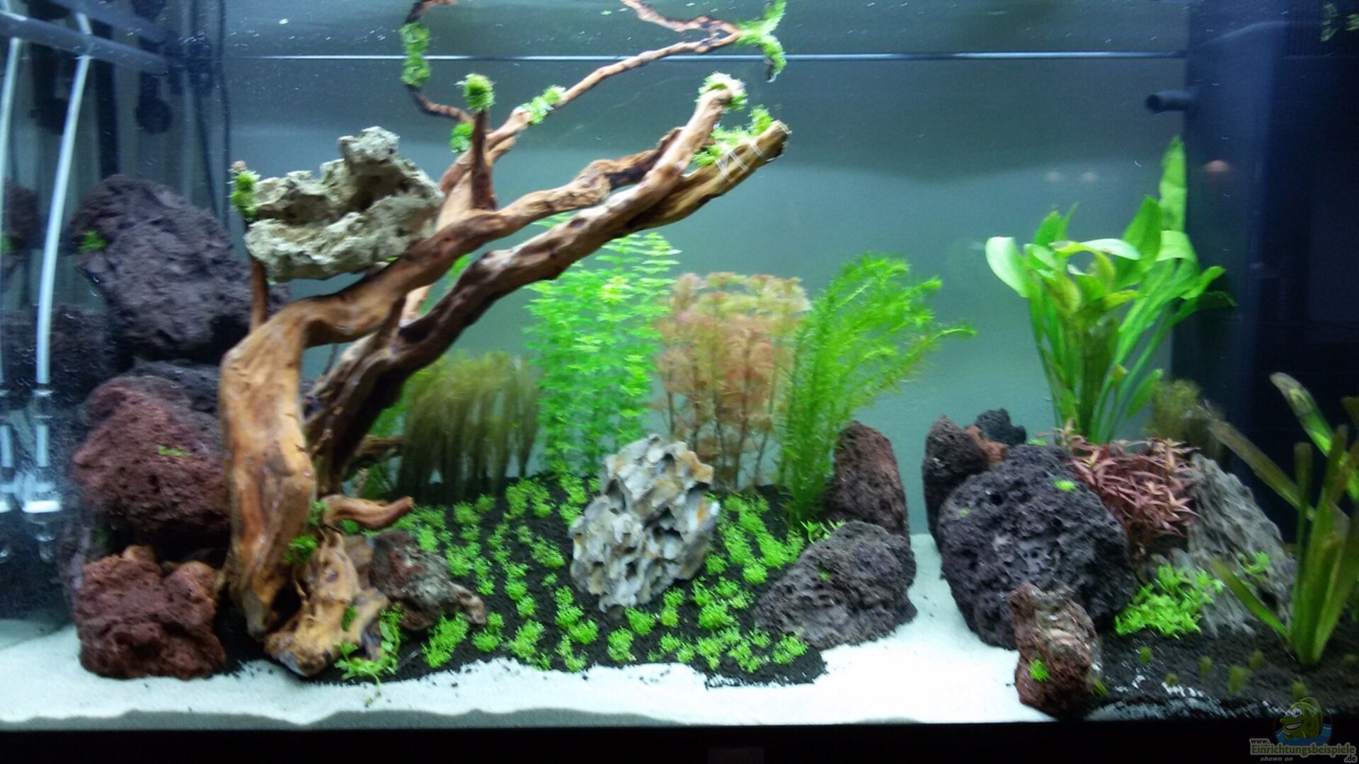 Das Hardscape wurde primär aus Islandlava/Drachenstein und Moorwood gestaltet. Die Lava wurde auf der linken Seite so angeordnet, dass diverse Versteckmöglichkeiten entstanden sind. Auf der rechten Hälfte des Beckens wurde eine kleine Schlucht aus der Lava gestaltet und darüber eine Wurzel platziert, damit auch hier ein Unterstand für meine Bewohner vorhanden ist. Durch den Einsatz von Sand, Schieferplatten und diversen Kleinkram, ist unter dem Innenfilter eine weitere Bruthöhle entstanden. [...]