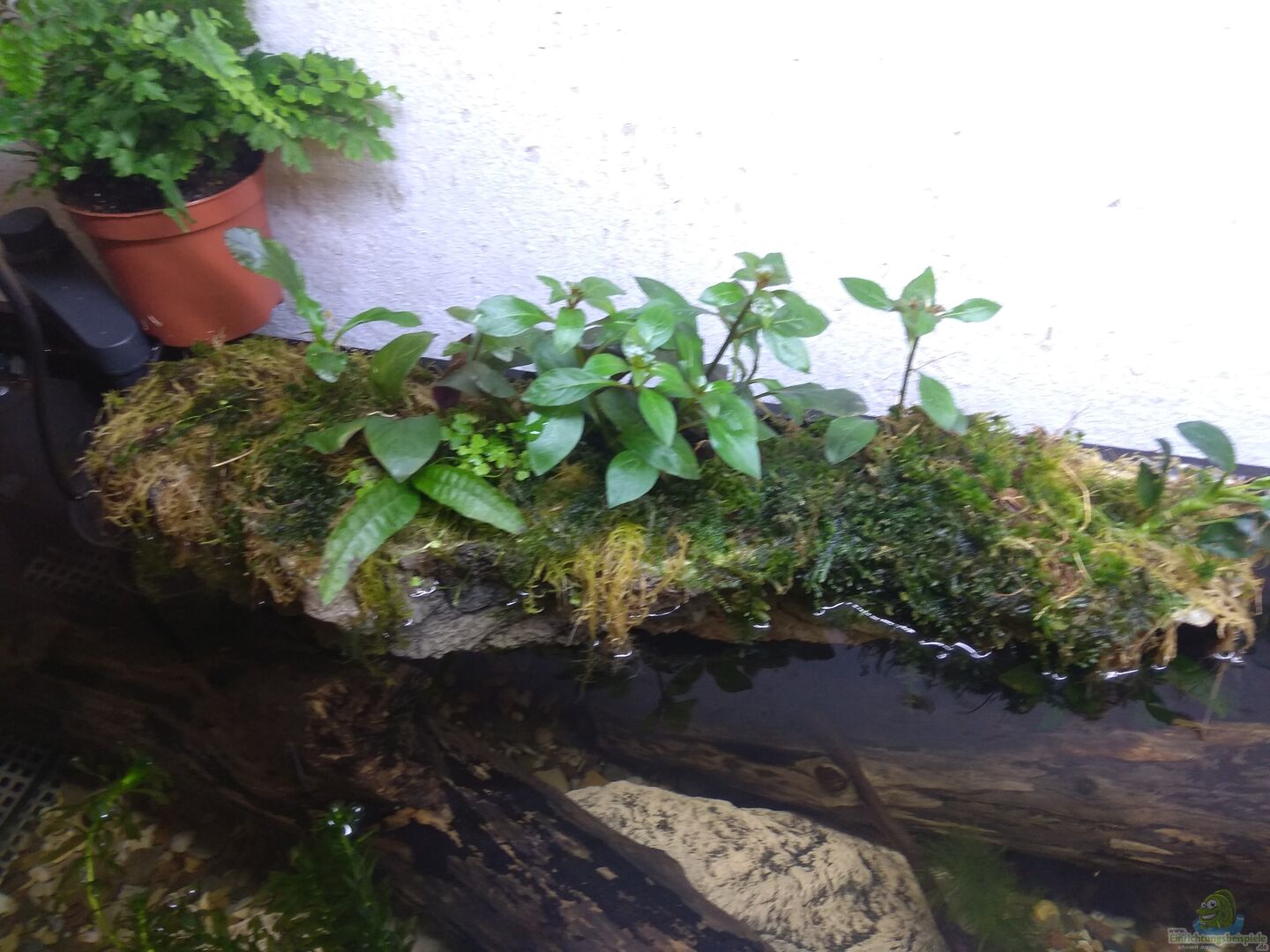 Einige Pflanzen wachsen emers im halben Stonemodul auf der linken Beckenseite. Das Modul ist verklebt und gefüllt mit Soil. An einigen Stellen ist eine Durchströmung des Moduls möglich. Diese Lücken wurden mit Watte ausgefüllt, um das Soil am Platz zu halten. Im emersen Bereich wachsen Lobelia cardinalis, Kardinalslobelie und Ludwigia repens var. Rubin - Ludwigia spec. "Diamond Red" in Soil und Sphagnummoos. Ebenso stehen dort zwei Farne: Adiantum pubescens und Dryopteris erytrosoria. Populärnamen [...]