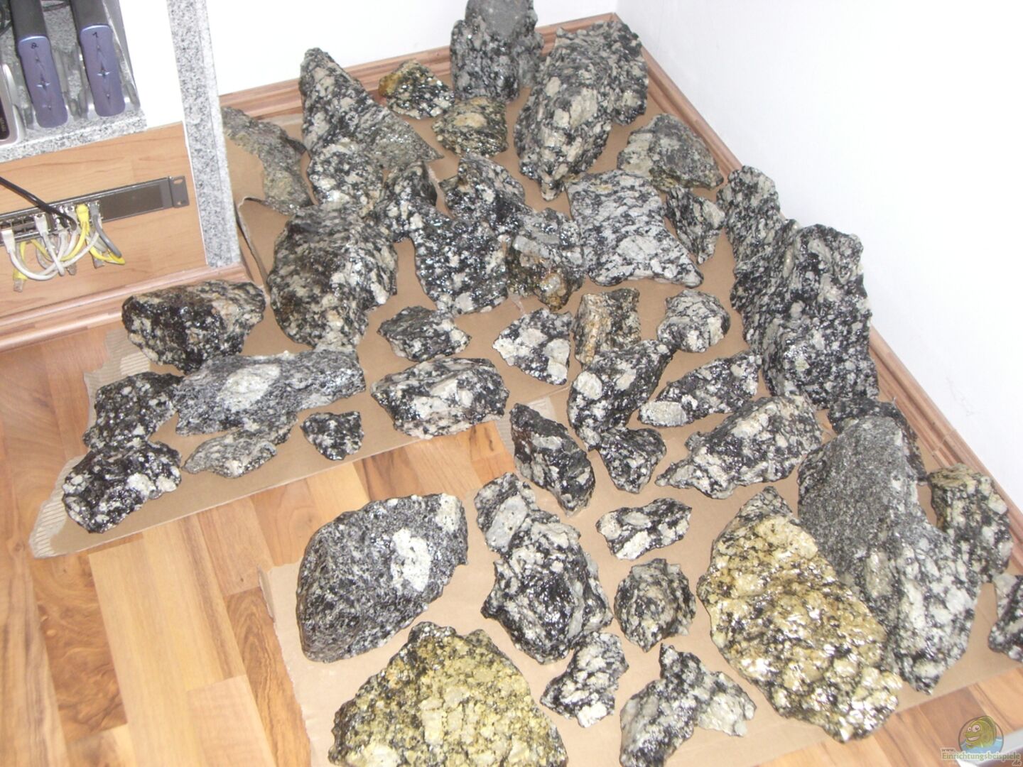 Die Rückwand besteht aus ca. 200 kg massiven Mühlviertler Granitsteinen, die ich vorher mit Epoxydharz versiegelt habe. Durch das versiegeln der Steine wurden scharfe Kanten abgerundet und die Oberfläche der Steine schön glatt. Das Problem am Granit ist, er ist verdammt schwer. Um das massive Gewicht der Rückwand gleichmässig zu verteilen, habe ich eine 1cm dicke Styroporplatte und eine 0, 5 cm dicke Plexiglasplatte untergelegt. Unbehandelter Granit nimmt aus dem Wasser viele Nährstoffe auf, [...]