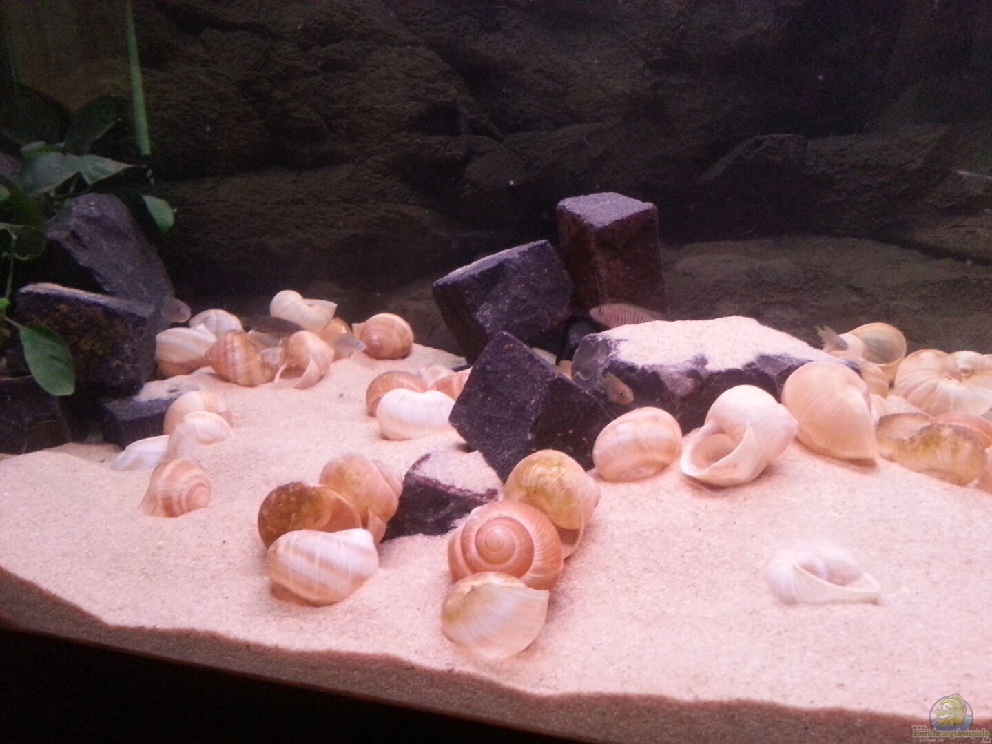 Im rechten und linken Beckenbereich befindet sich ein Steinaufbau aus Basaltgestein. Vereinzelt bilden weitere einzelne Basaltgesteine einige Reviergrenzen. Die rechte Seitenscheibe ist, wie auch der rechte Bodenbereich, mit einem Elemt der Juwel Motivrückwand Stone Granite versehen. Die beiden Elemente hatte ich noch aus meinem 112er Multibecken übernommen, da ich keinerlei andere Verwendung dafür hatte. Die hintere Scheibe des Aquariums ist mit einer Motivfolie im Look "graue [...]