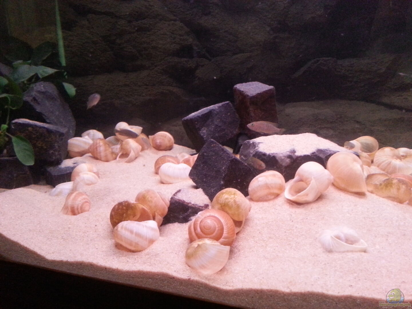 Im rechten und linken Beckenbereich befindet sich ein Steinaufbau aus Basaltgestein. Vereinzelt bilden weitere einzelne Basaltgesteine einige Reviergrenzen. Die rechte Seitenscheibe ist, wie auch der rechte Bodenbereich, mit einem Elemt der Juwel Motivrückwand Stone Granite versehen. Die beiden Elemente hatte ich noch aus meinem 112er Multibecken übernommen, da ich keinerlei andere Verwendung dafür hatte. Die hintere Scheibe des Aquariums ist mit einer Motivfolie im Look "graue [...]