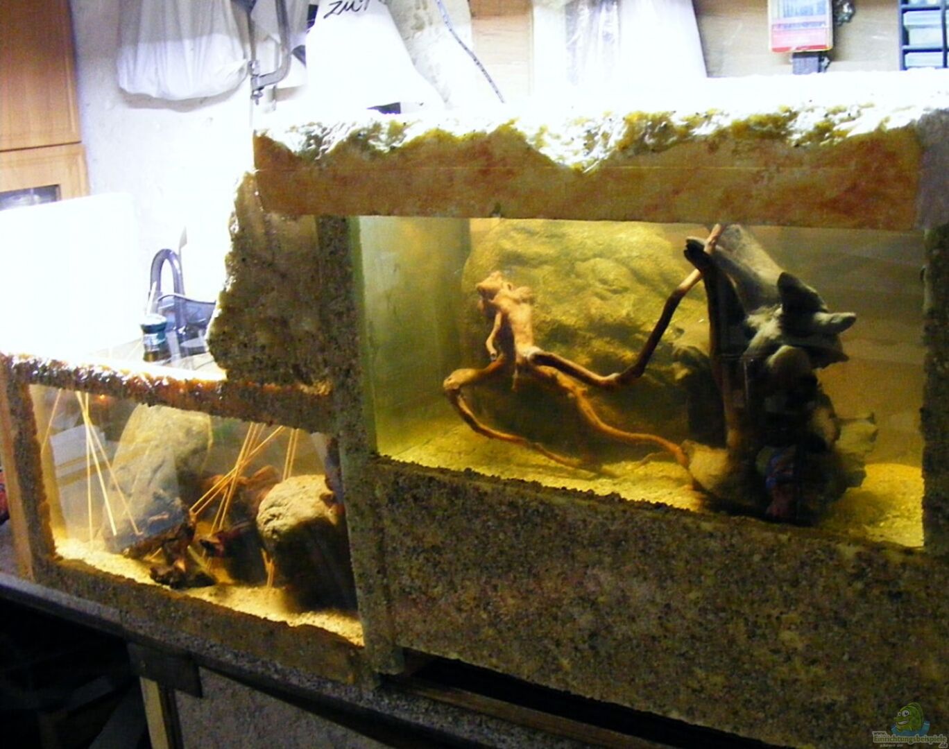 Zur Legende... zwei alte 60l-Becken sollten entsorgt werden, dienen jetzt für dieses Projekt. Dabei wird das Becken mit Flu??lauf(das Obere) um 25cm höher gestellt. Am Ende zum unteren Becken wird eine modellierte Kante geformt , die es ermöglicht, das gepumpte und auch gefilterte Wasser in breiter Form ins untere Becken fallen zu lassen. Desweiteren ein ´Gebirge´ bzw. Uferböschung an den Seiten des oberen Beckens instaliert wird , welches mit subalpinen Wasserpflanzen bestückt [...]