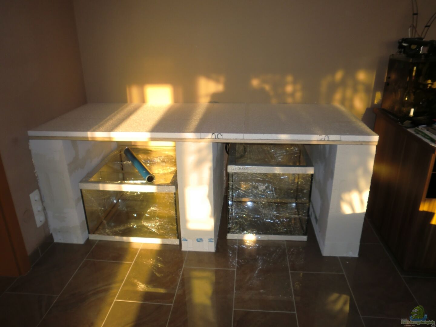 Becken: 15mm Optiwhite Verglasung, 19mm Boden mit Sicherheitsstreben rundherum Sto??verklebung, geschliffene Kanten Ablaufkasten: 30x18cm links hinten (Unterbau-Sockel bedingt um 25cm hereingerutscht) Bohrungen: 1x40mm Ablauf, 1x32mm Notablauf, 1x25mm Rückförderung, 1x60mm Versorgung Trockenschacht: 10x18cm mit 60mm Bohrung (für Kabel, Schläuche ect., damit lästiges herum arbeiten hinter dem Aquarium erspart bleibt) Unterbau (7. Stock) nach Statikergutachten direkt auf Grundplatte. [...]