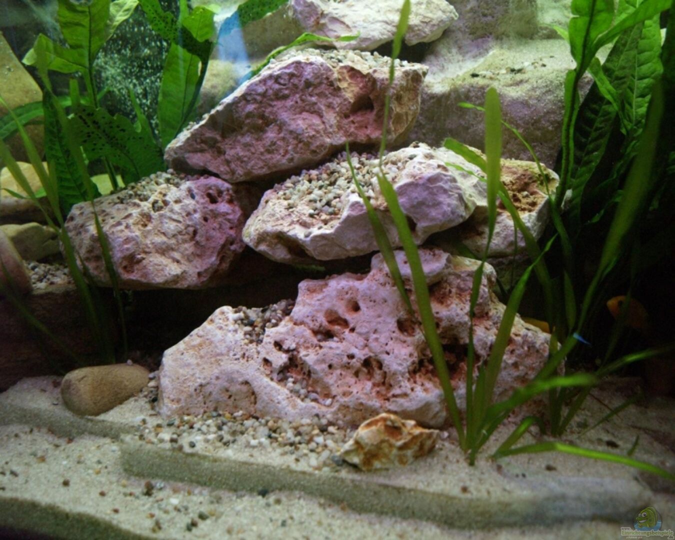Hintergrundelemente aus Glasfasermatten/Harz (gekauft) und individualisirt (Silikon+Sand). Zudem 2 Höhlenöffnungen ausgeschnitten und mit Styropor/Aquarienmörtel/Silikon/Sand Höhlenräume gebildet. Im linkem Element ist eine gro??e Hohlenöffnung wodurch dieser Hohlraum im Element als Schwimmbereich den Barschen völlig frei steht und mehr Schwimmraum zur Verfügung steht als bei Höhlen in der ´Massivbauweise´. Hier liegen ausserdem Heizstab und Ansaugung der Pumpe. Terasse mit aus 100cm [...]