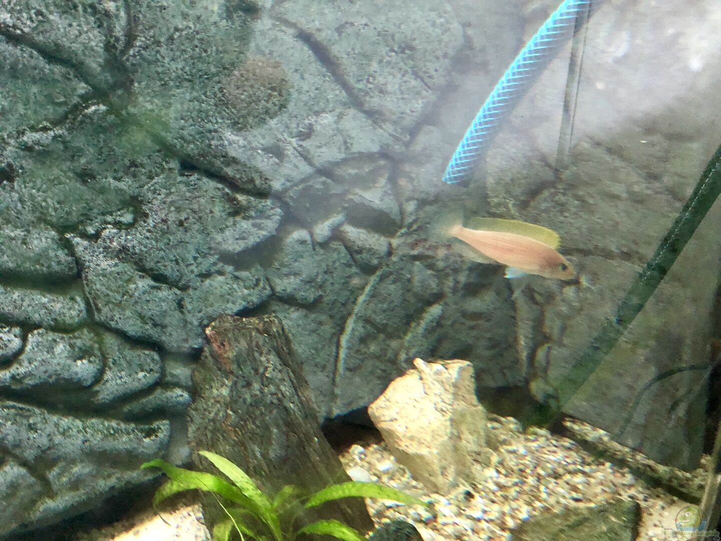 1.2.x Paracyprichromis nigripinnis (die Jungfische wachsen sehr gut) 3.1.x Neolamprologus caudopunctatus (ein Pärchen, das fleißig brütet) 0.1 Ancistrus spec. (älteres Tier, das hier seinen Platz fand)