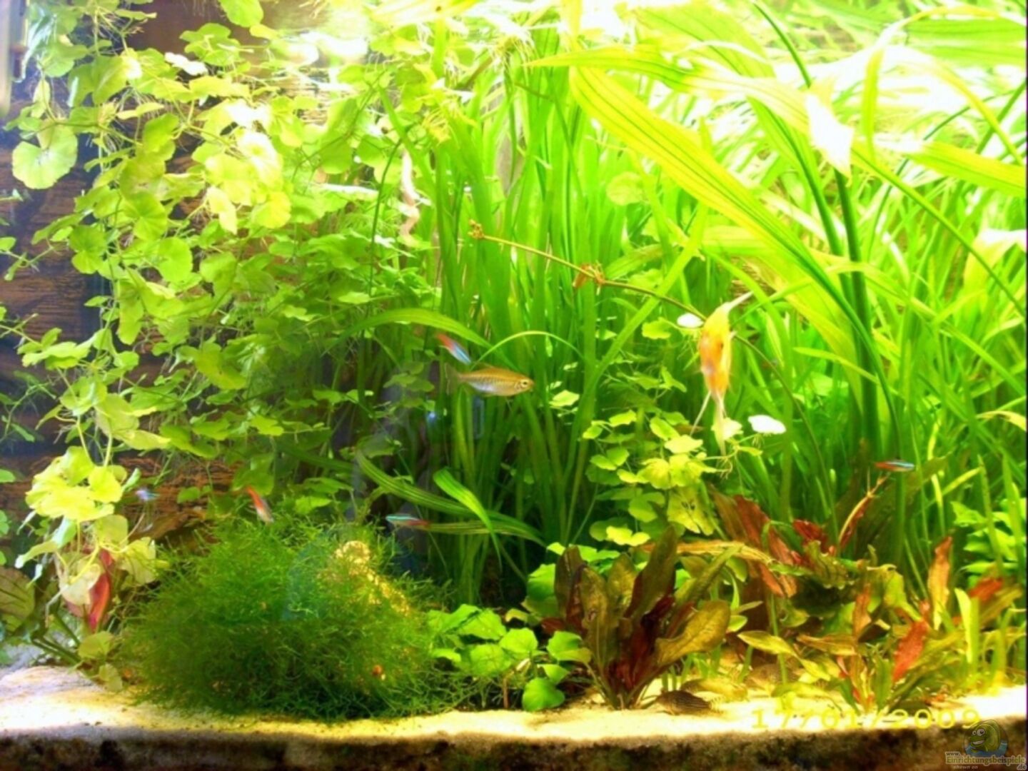 3D Rückwand 5-16cm tief einige Schieferplatten, die fast komplett im Sand vergraben sind um Verletzungen der Fische zu vermeiden und Lavasteine 3 gro??e Wurzeln, teilweise mit Javamoos bewachsen