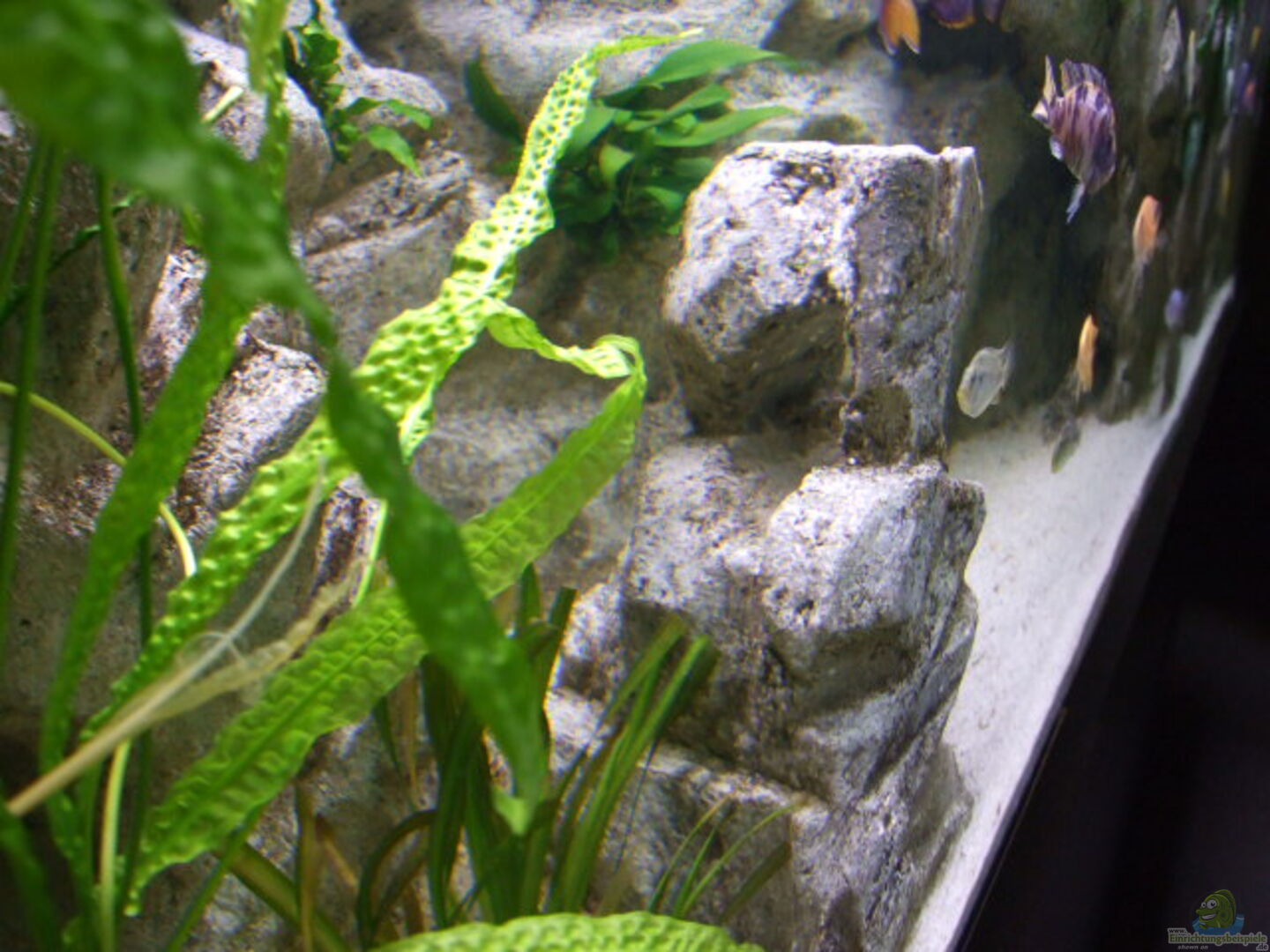 Hintergrund selbstgebaut aus Styropor, zurechtgeschitten, eingeklebt, geformt, Höhlen und Verstecke geschaffen, auch die Steinaufbauten mit Höhlen im Vordergrund aus dem selben Material, farblich gestaltet. Den Rest besorgt die Zeit durch Algenwachstum