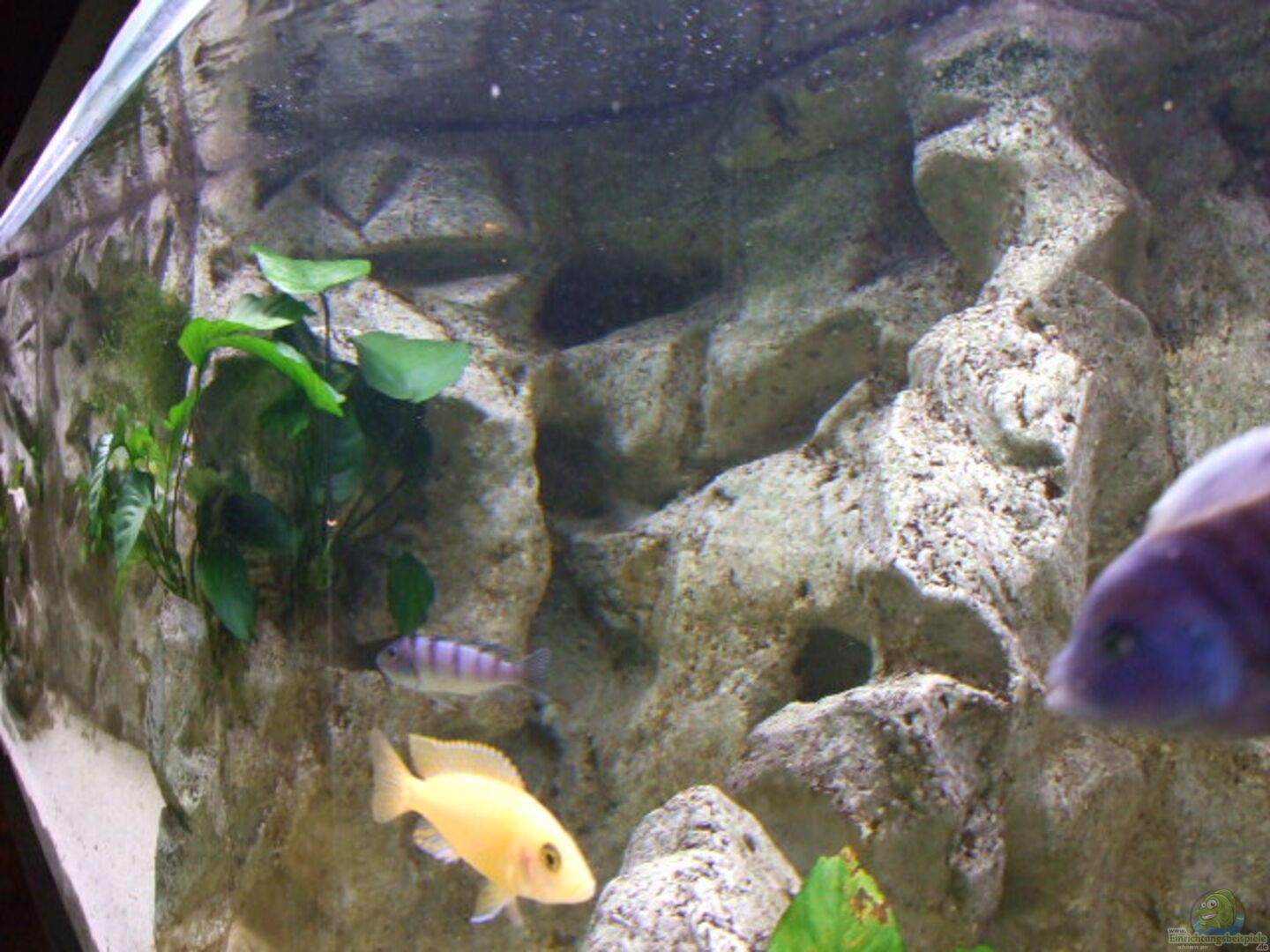 Hintergrund selbstgebaut aus Styropor, zurechtgeschitten, eingeklebt, geformt, Höhlen und Verstecke geschaffen, auch die Steinaufbauten mit Höhlen im Vordergrund aus dem selben Material, farblich gestaltet. Den Rest besorgt die Zeit durch Algenwachstum