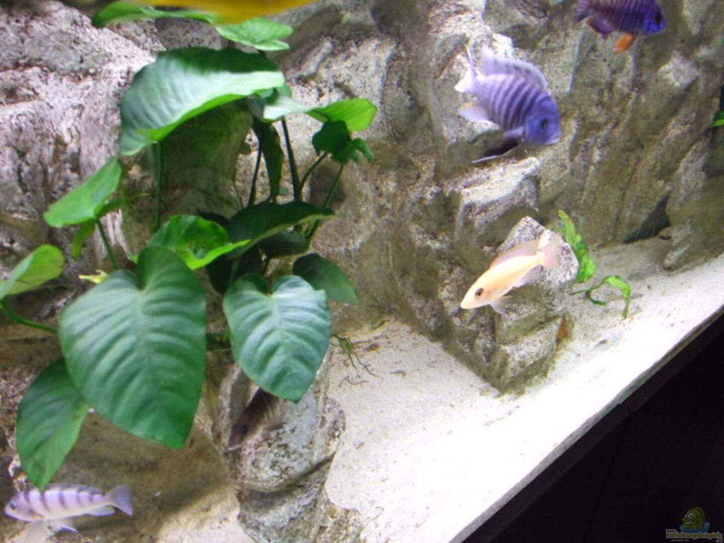 Hintergrund selbstgebaut aus Styropor, zurechtgeschitten, eingeklebt, geformt, Höhlen und Verstecke geschaffen, auch die Steinaufbauten mit Höhlen im Vordergrund aus dem selben Material, farblich gestaltet. Den Rest besorgt die Zeit durch Algenwachstum