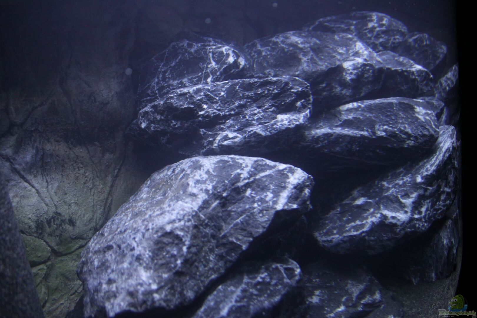 3D-Rückwand Thin Felsstruktur, Tiefe ca. 2 cm ca. 80 kg Bruchsteine rechte Seitenscheibe schwarz angemalt (an der linken Scheibe ist der HMF)