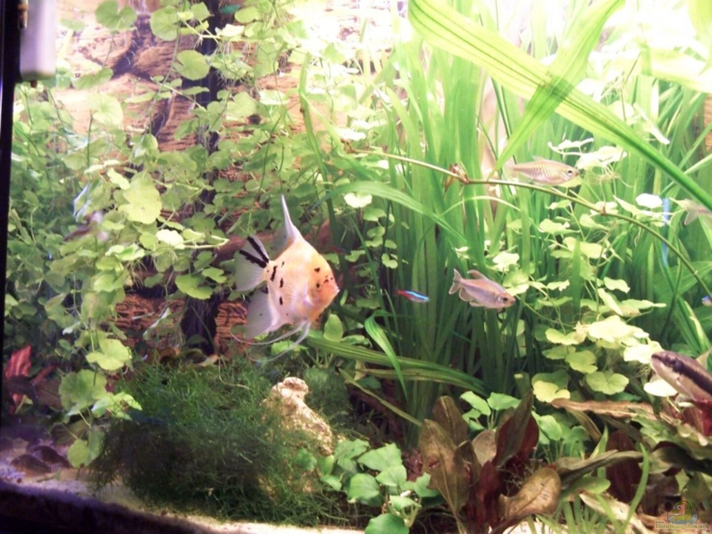 3D Rückwand 5-16cm tief einige Schieferplatten, die fast komplett im Sand vergraben sind um Verletzungen der Fische zu vermeiden und Lavasteine 3 gro??e Wurzeln, teilweise mit Javamoos bewachsen
